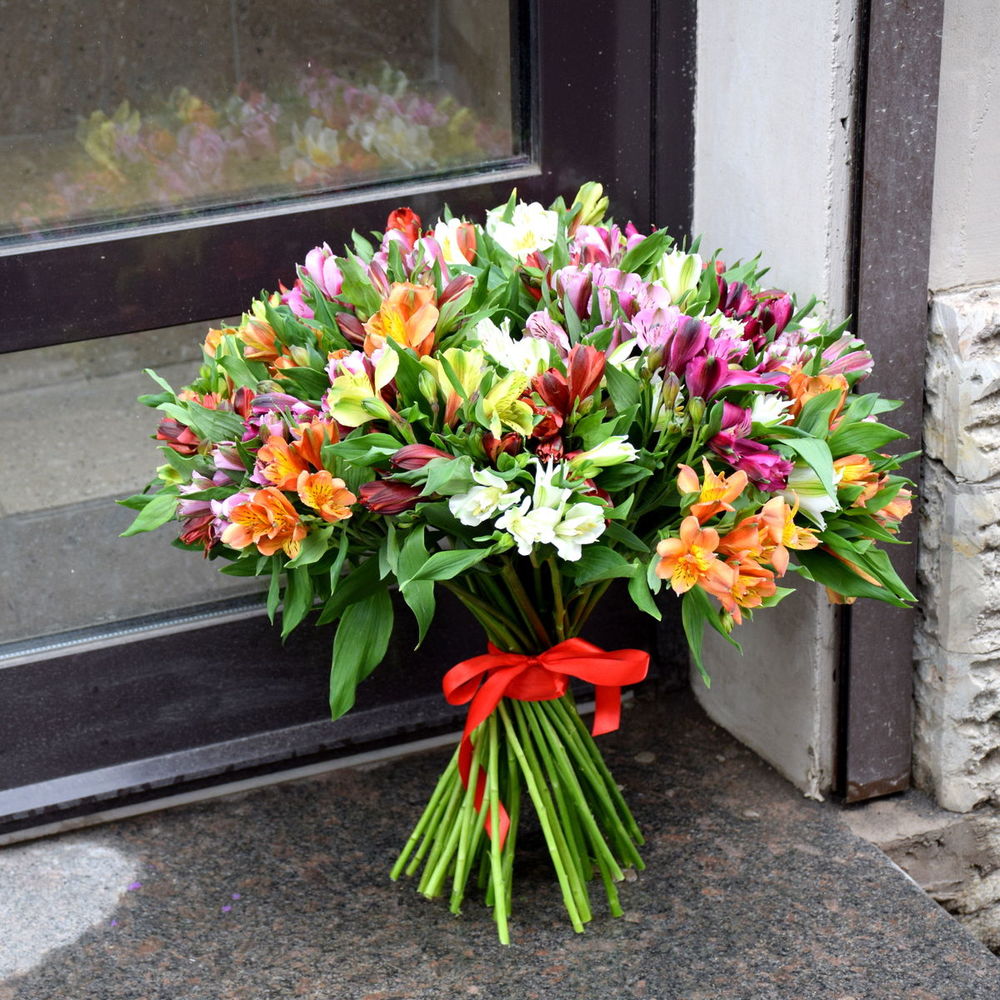 Моно букет из разноцветных альстромерий (51 штука), перевязанный атласной лентойСтойкий и невероятно красивый букет обязательно обрадует получателя.