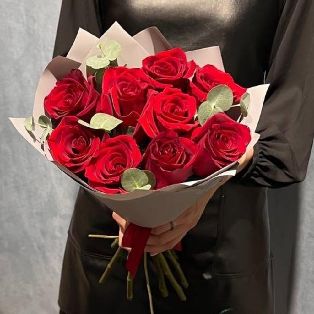 Эвкалипт – 3 шт.бордовые эквадорских розы – 9 шт.