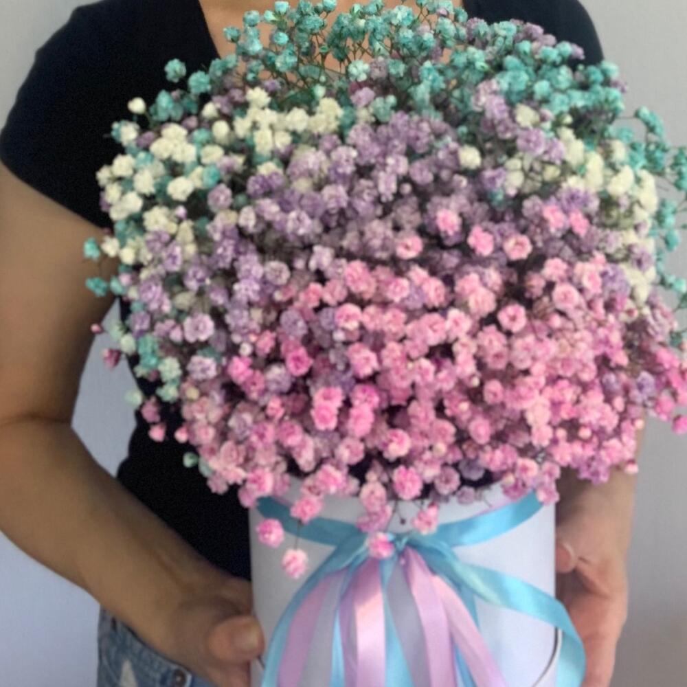 “Сиреневый туман” – композиция из гипсофилы в шляпной коробке