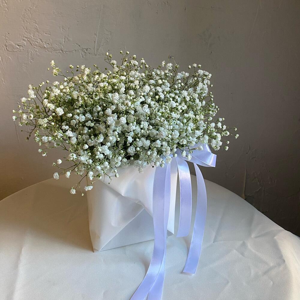 гипсофила белая – 5 шт.Упаковка дизайнерская – 2 шт.Лента атласная – 2 шт.открытка для пожеланий – 1 шт.