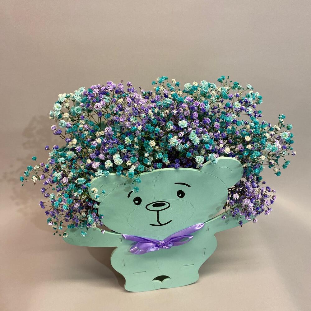 гипсофила радужная – 7 шт.Ящик деревянный – 1 шт.Оазис флористический – 1 шт.