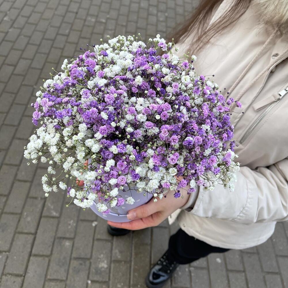 Трендовая Гипсофила в шляпной коробке Простоит месяц Удобно дарить и ухаживать Приятная цена Красивые оттенки