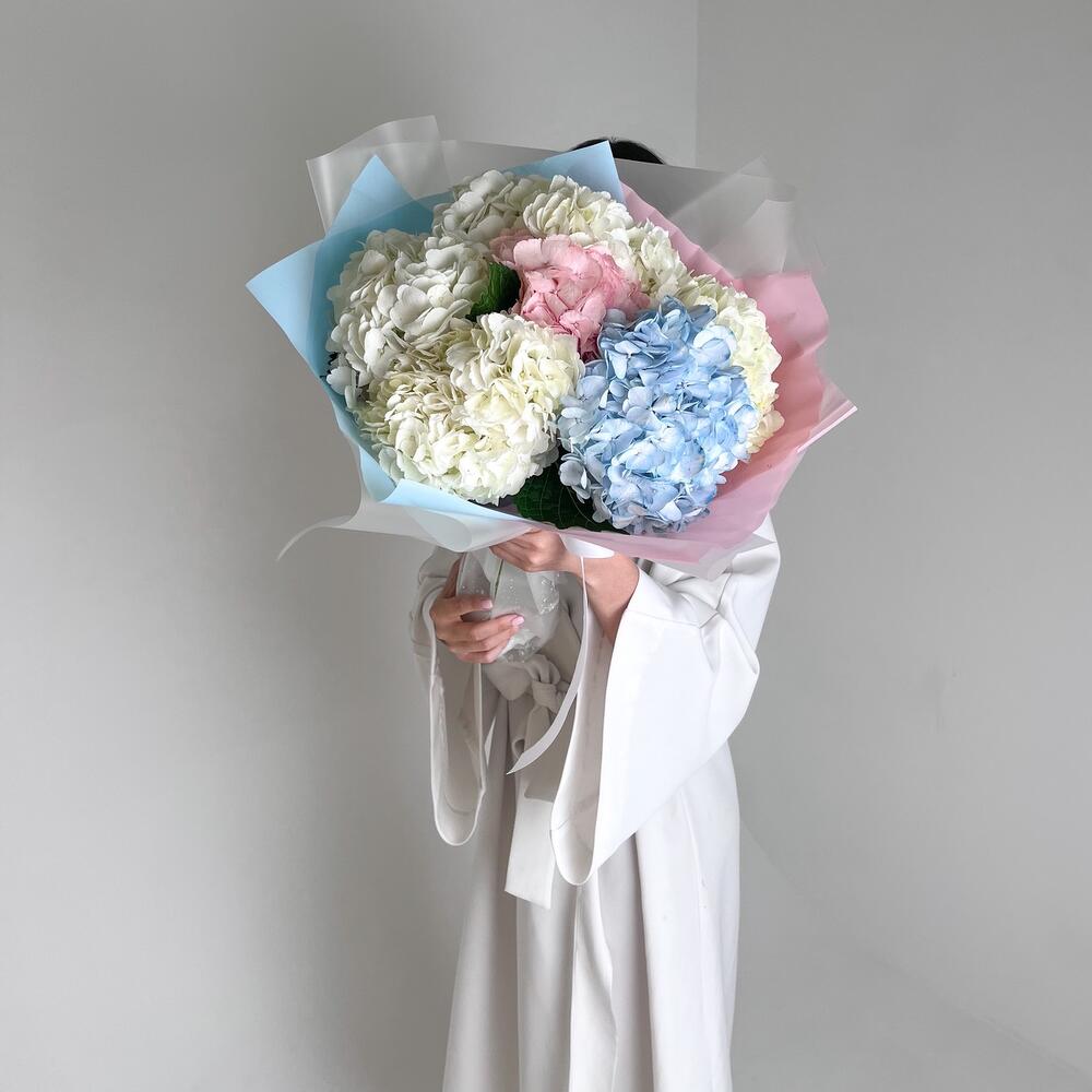 гортензия колумбия – 7 шт.Упаковка дизайнерская – 1 шт.ленты фирменные – 1 шт.
