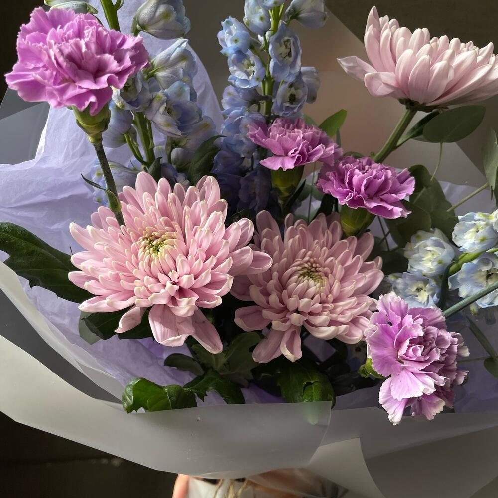 Дельфиниум – 3 шт.Эвкалипт – 2 шт.Хризантема – 3 шт.Гвоздика – 5 шт.Упаковка дизайнерская – 3 шт.