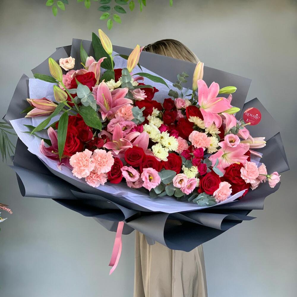 Альстромерии, Гвоздики, Кустовые розы, Лизиантусы, Розы, Хризантемы