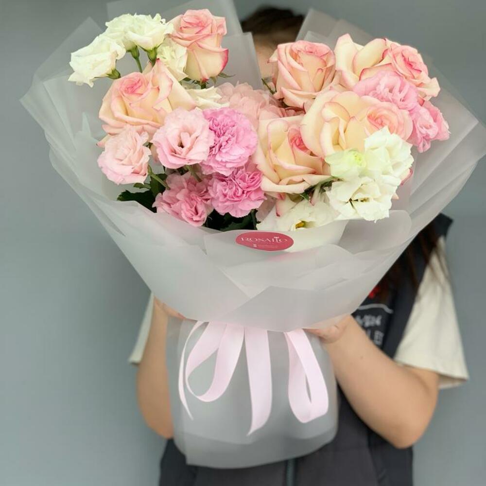 Альстромерии, Гвоздики, Кустовые розы, Лизиантусы, Розы, Хризантемы