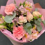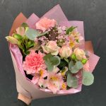 Букет с альстромериями, кустовой розой, гвоздикой и ваксфлауэром