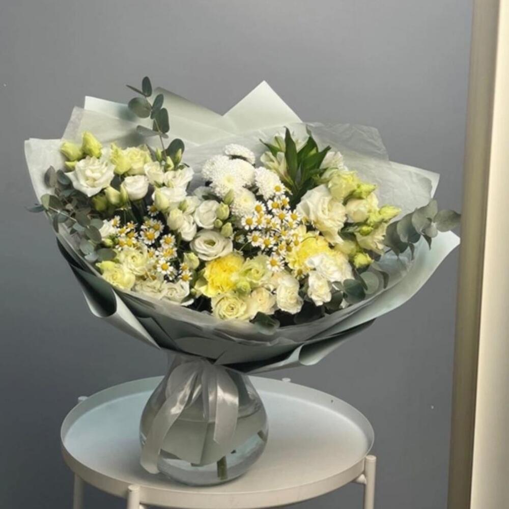 Альстромерия – 2 шт.Лизиантус – 5 шт.Хризантема Сантини – 3 шт.Гвоздика – 3 шт.Матрикария – 3 шт.Упаковка дизайнерская – 1 шт.