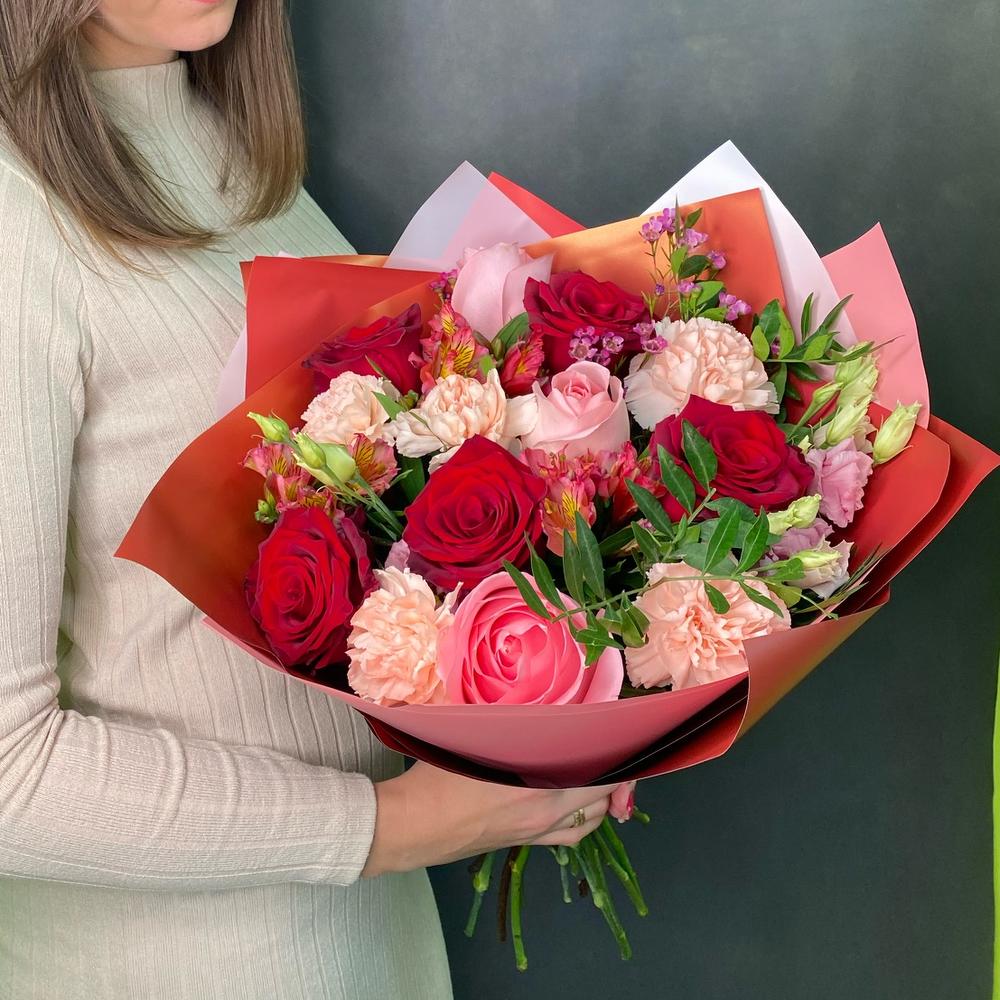 Категории: АльстромерииРозы, Гвоздики, Лизиантусы