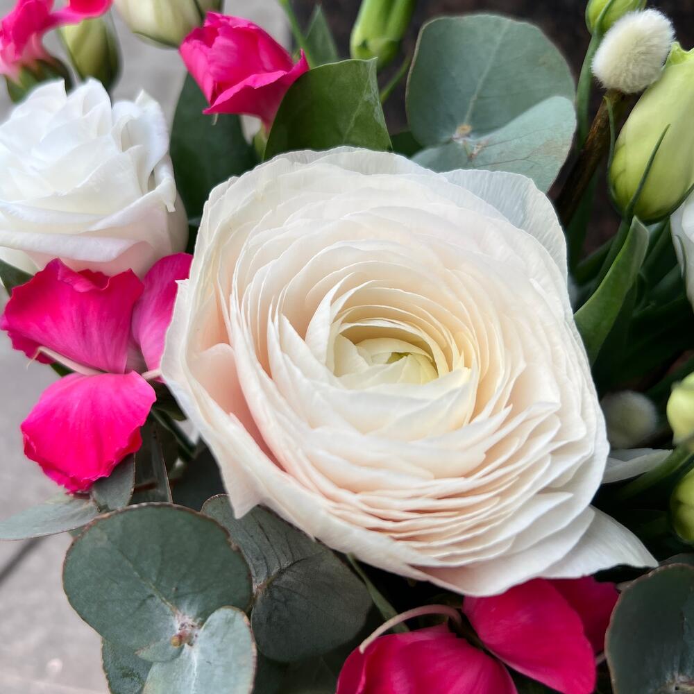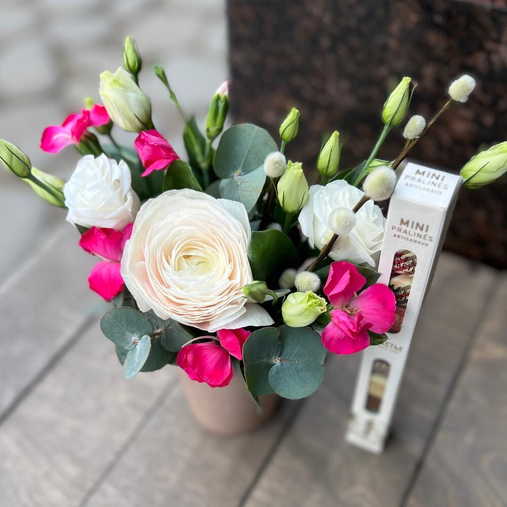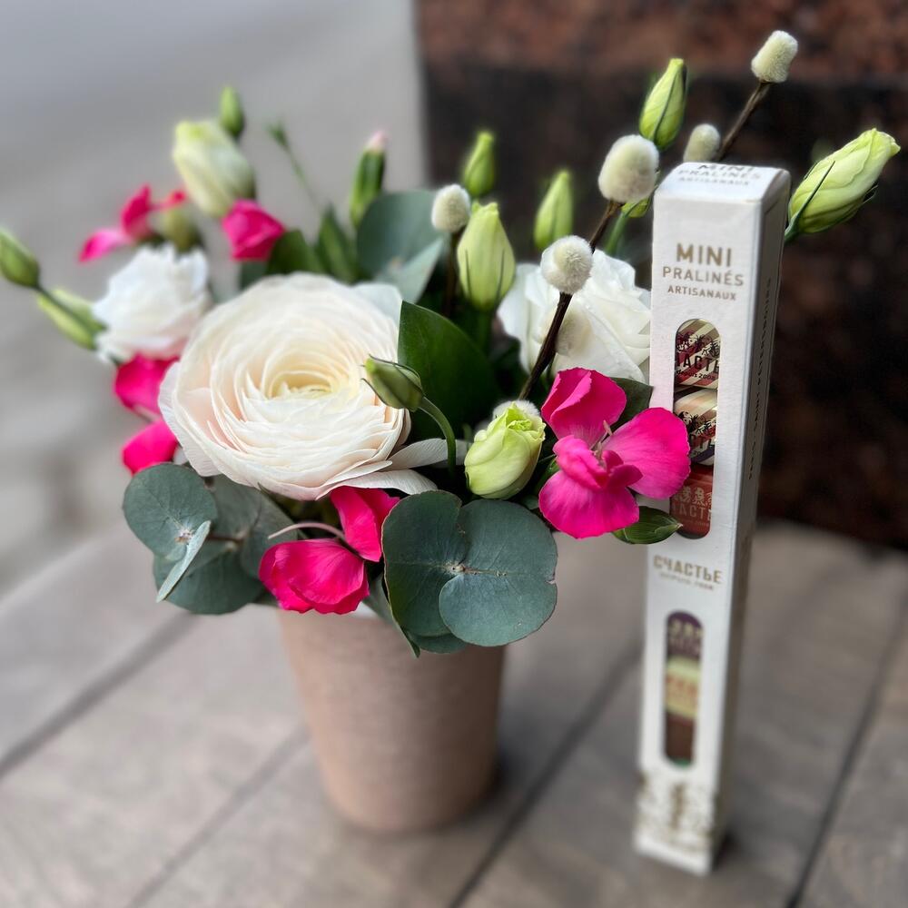 Лизиантус – 1 шт.Эвкалипт – 1 шт.Ранункулюс – 1 шт.Оазис флористический – 1 шт.стакан кофейный – 1 шт.шоколад счастье – 1 шт.соломиа гвоздика – 2 шт.