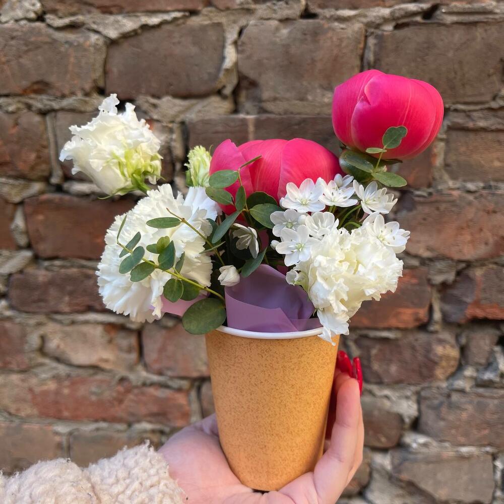 Лизиантус – 1 шт.Пион – 2 шт.Эвкалипт – 1 шт.Гвоздика – 1 шт.Губка флористическая – 1 шт.стакан крафт – 1 шт.
