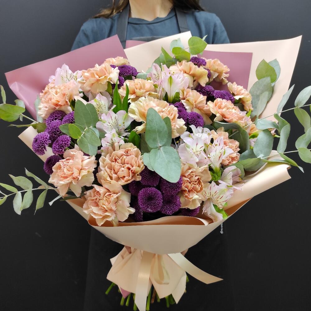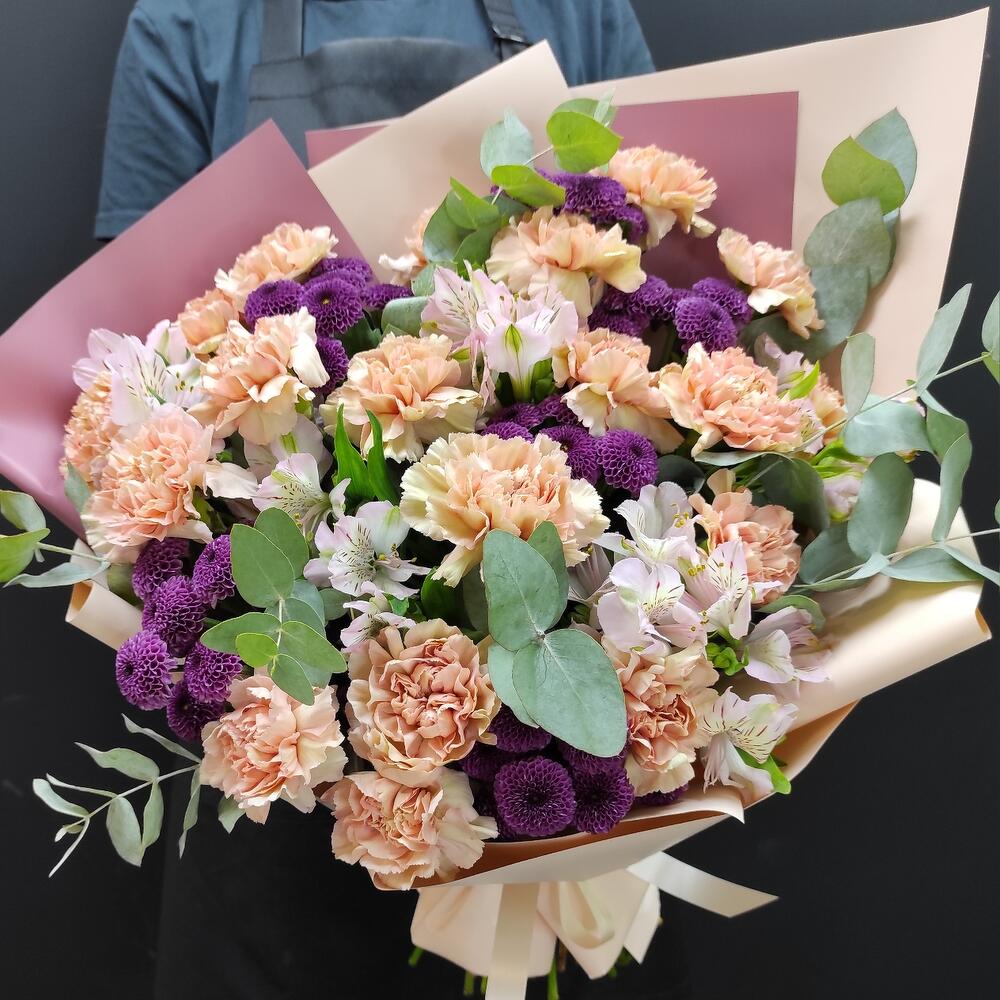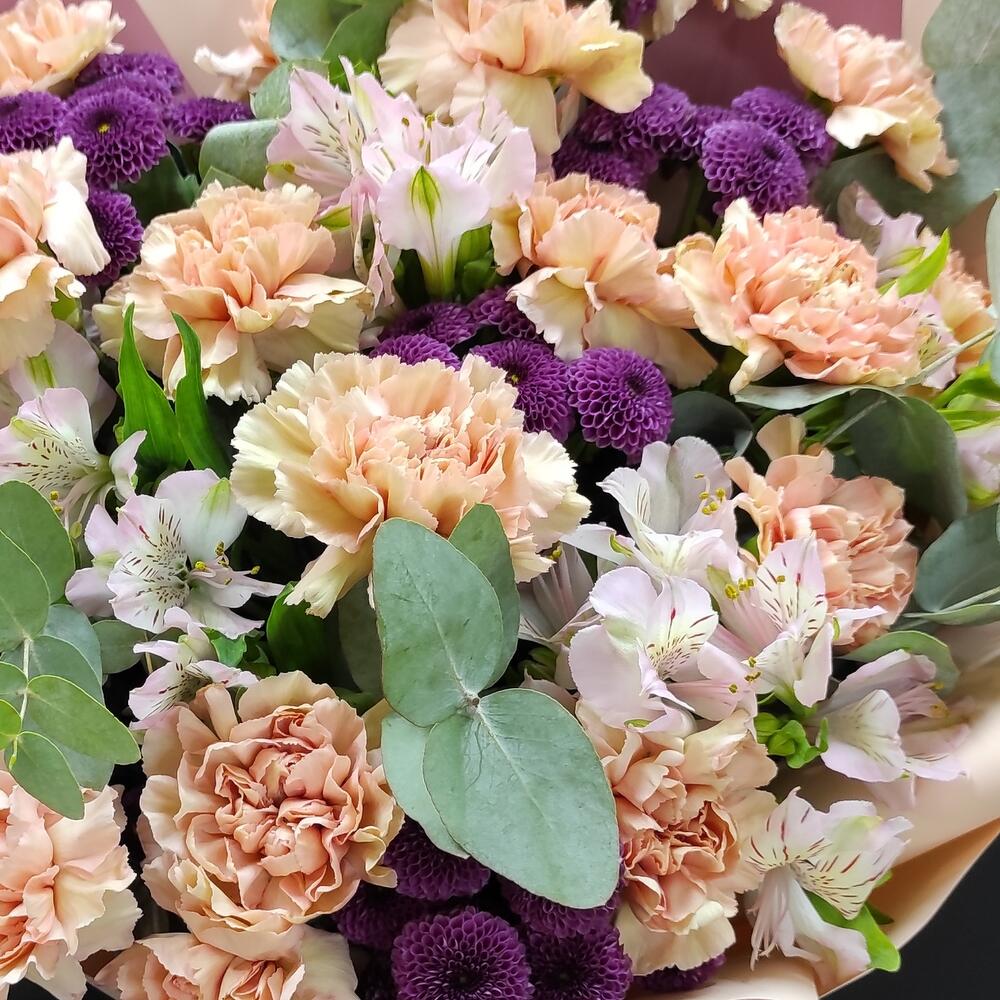 Альстромерии, Гвоздики, Кустовые розы, Лизиантусы, Розы, Хризантемы
