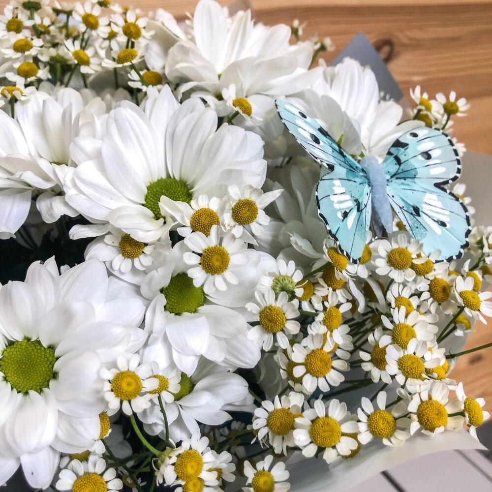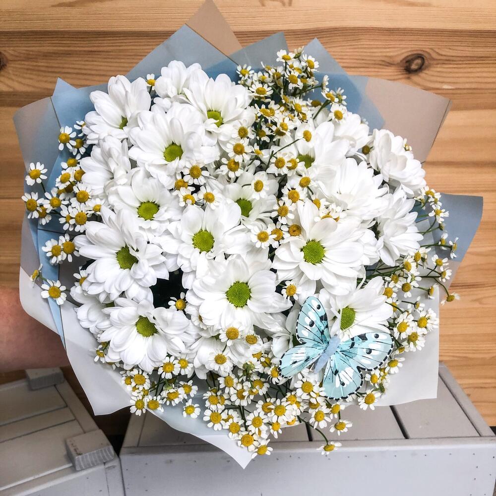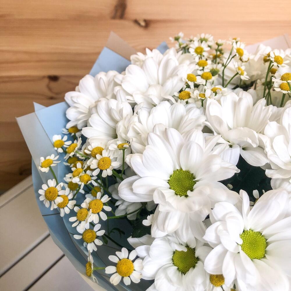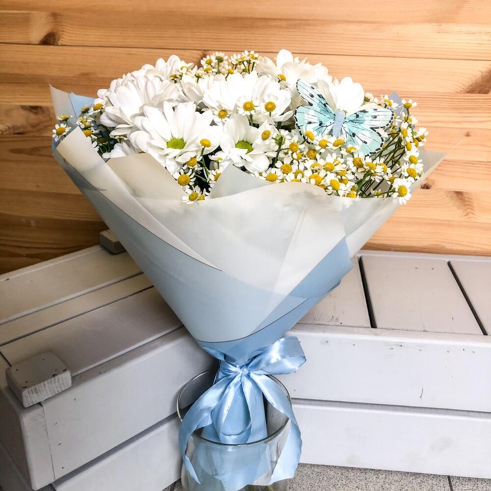 Танацетум – 7 шт.Хризантема Сантини – 4 шт.Упаковка дизайнерская – 1 шт.Лента атласная – 1 шт.