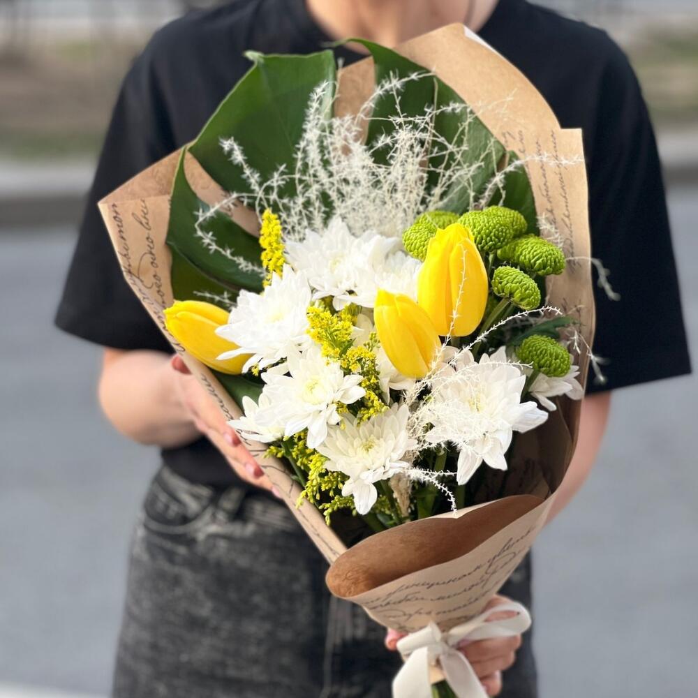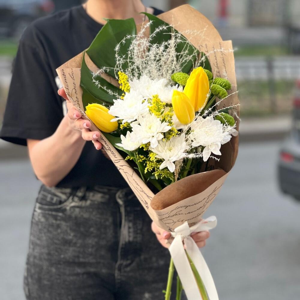 Монстера – 1 шт.Солидаго – 2 шт.Тюльпан – 3 шт.Лента атласная – 1 шт.Хризантема зеленая – 1 шт.Упаковка дизайнерская – 1 шт.хризантема куст белая – 2 шт.пампас белый – 2 шт.