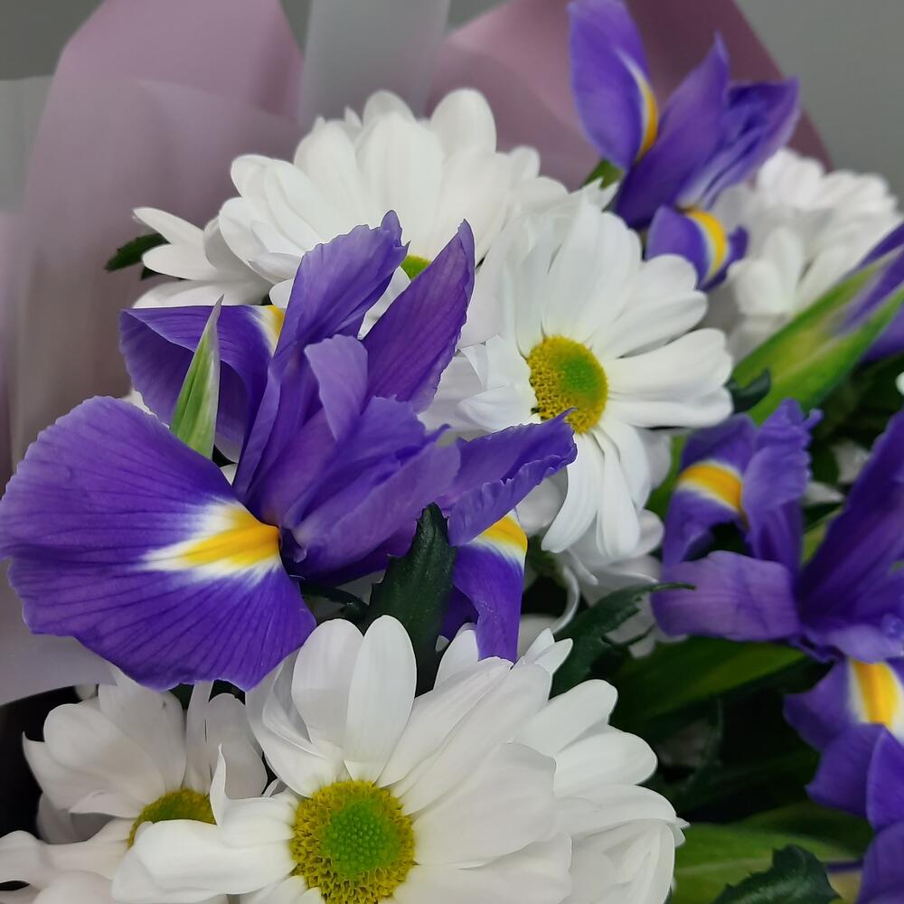 Хризантема кустовая ромашковая – 5 шт.Ирис Blue Magic – 11 шт.Упаковка дизайнерская – 2 шт.