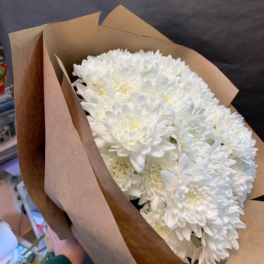 Лента – 1 шт.Хризантема кустовая – 5 шт.Упаковка крафт – 1 шт.