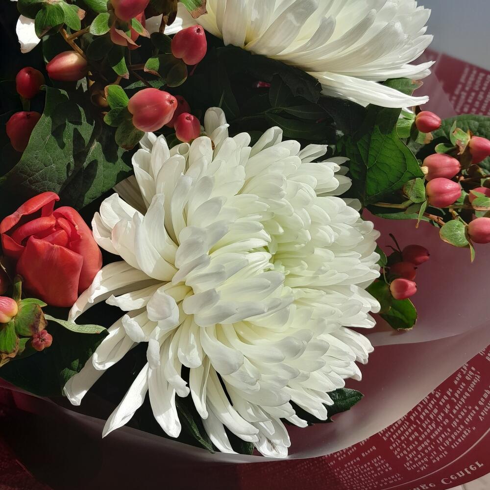 Букет из хризантем, тюльпанов и хиперикума