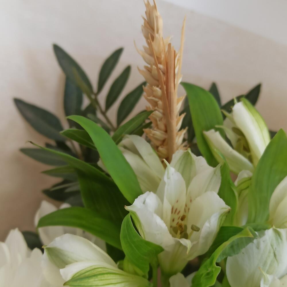 розы венделла – 2 шт.Хризантема одноголовая белая – 1 шт.Хризантема кустовая – 3 шт.Матрикария – 3 шт.Фисташка – 5 шт.Хлопок натуральный – 2 шт.Пшеница (сухоцвет) – 5 шт.Альстромерия – 3 шт.Дизайнерская упаковка – 2 шт.