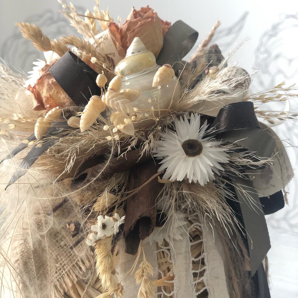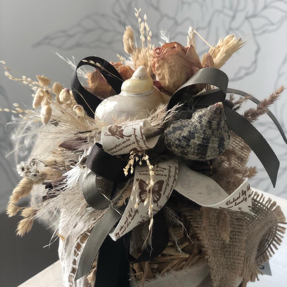 декоративные ленты – 2 шт.букет из сухоцветов – 3 шт.Палочки корицы – 3 шт.набор ракушек – 1 шт.ковыль пучок сухоцвет – 3 шт.Лента хлопок – 3 шт.бриза пучок – 2 шт.Гелихризум – 3 шт.Наполнитель стружка – 2 шт.спил дерева – 1 шт.