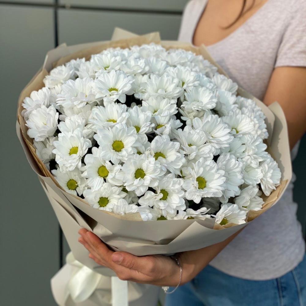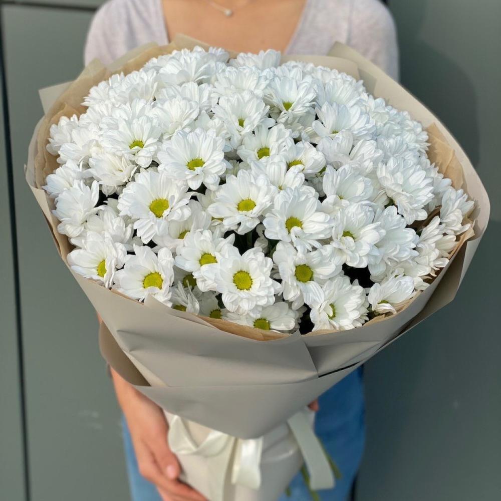 Хризантема кустовая – 13 шт. Упаковка дизайнерская – 1 шт. Открыточка с вашими пожеланиями – 1 шт.