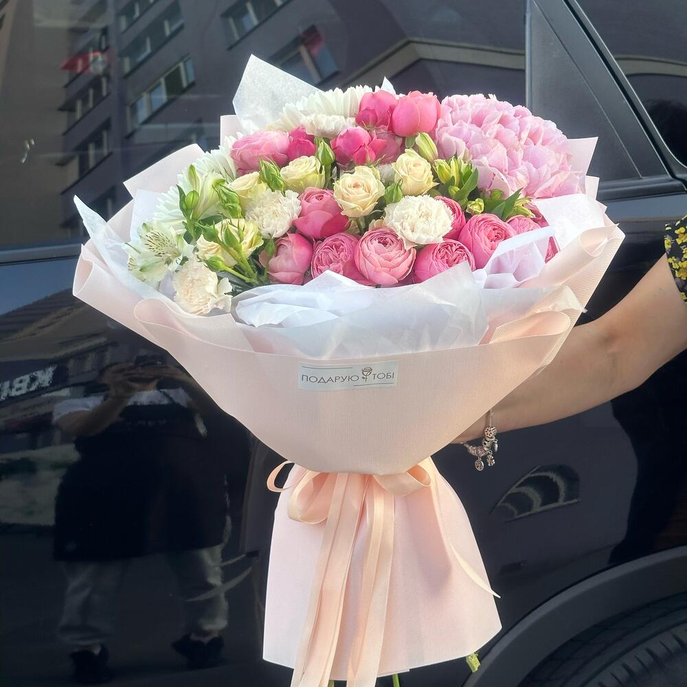 Альстромерии, Гортензии, Кустовые розы, Лизиантусы, Розы, Хризантемы