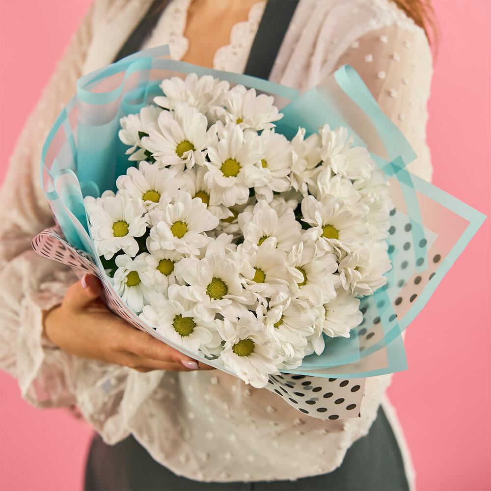 хризантема кустовая (белый) – 11 шт.пленка цветная – 1 шт.лента атласная (синий) – 1 шт.
