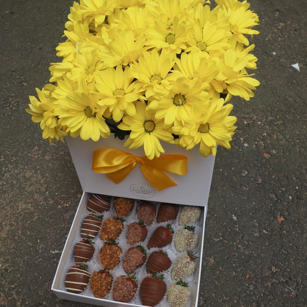 Хризантема кустовая – 9 шт.Коробка шляпная – 1 шт.Клубника в шоколаде – 20 шт.