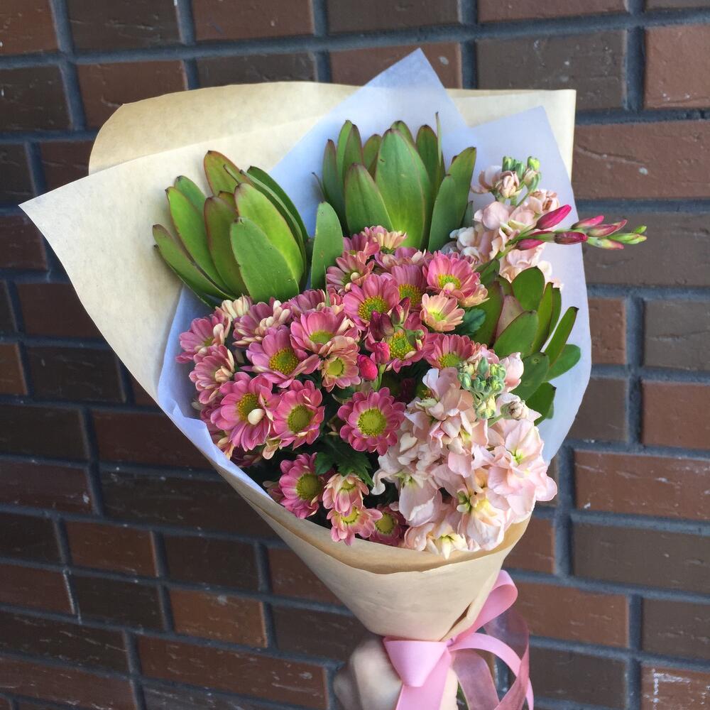 леукондендрон – 3 шт.Маттиола – 2 шт.Хризантема Сантини – 2 шт.иксия – 2 шт.