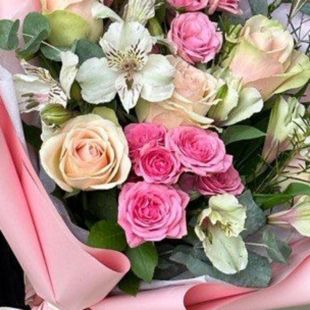 роза кения 40 см – 5 шт.Роза кустовая – 2 шт.Альстромерия – 2 шт.