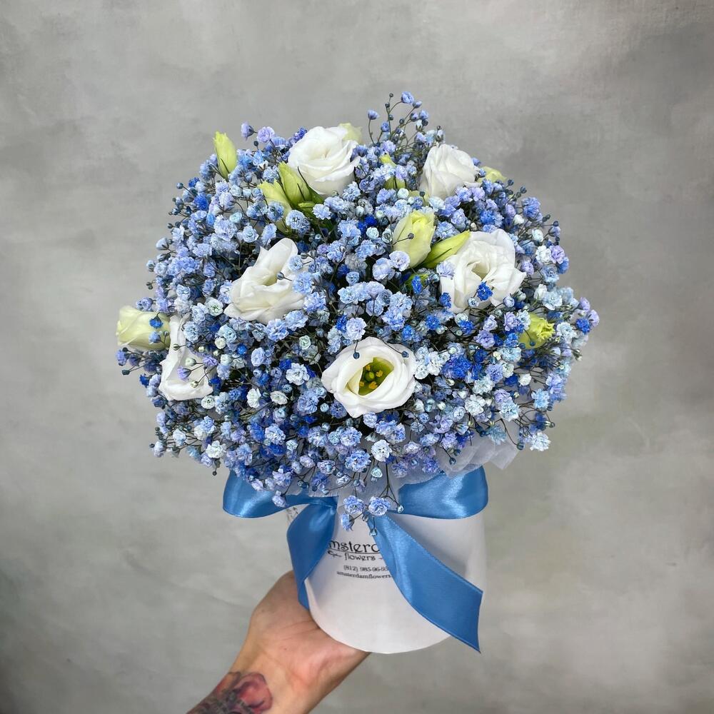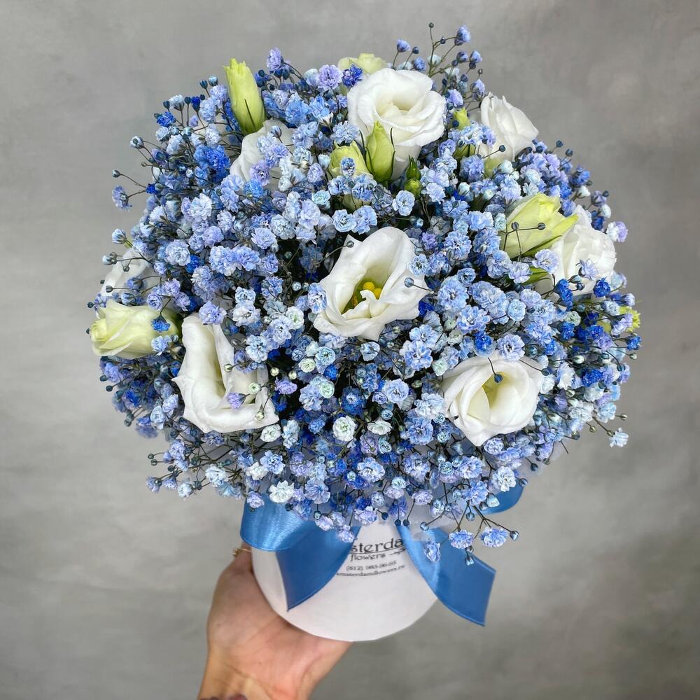 Гипсофила – 6 шт.Лизиантус – 5 шт.Коробка шляпная – 1 шт.Оазис флористический – 1 шт.