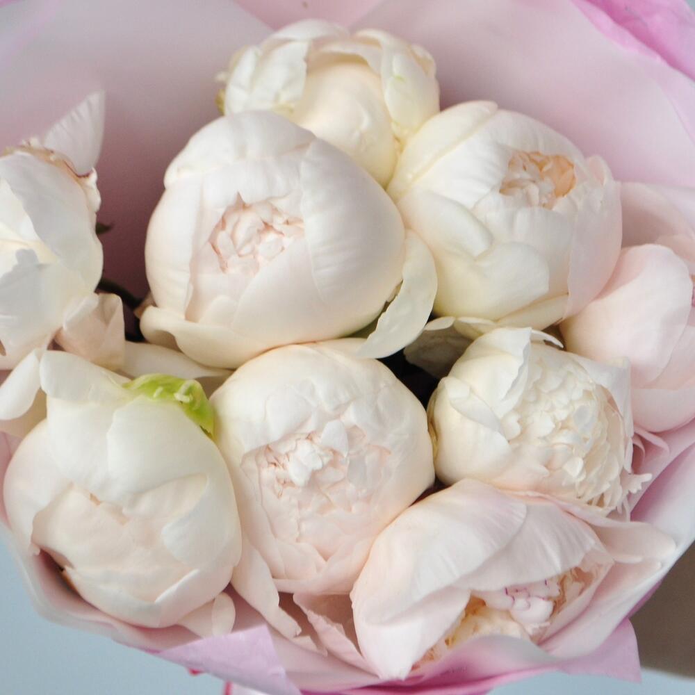 Лента атласная – 1 шт.Пион белый – 9 шт.Упаковка дизайнерская – 2 шт.