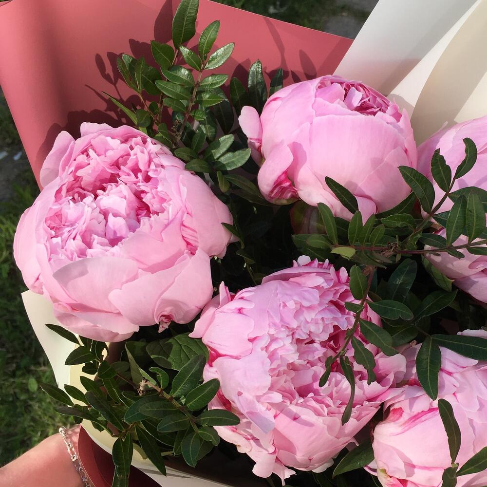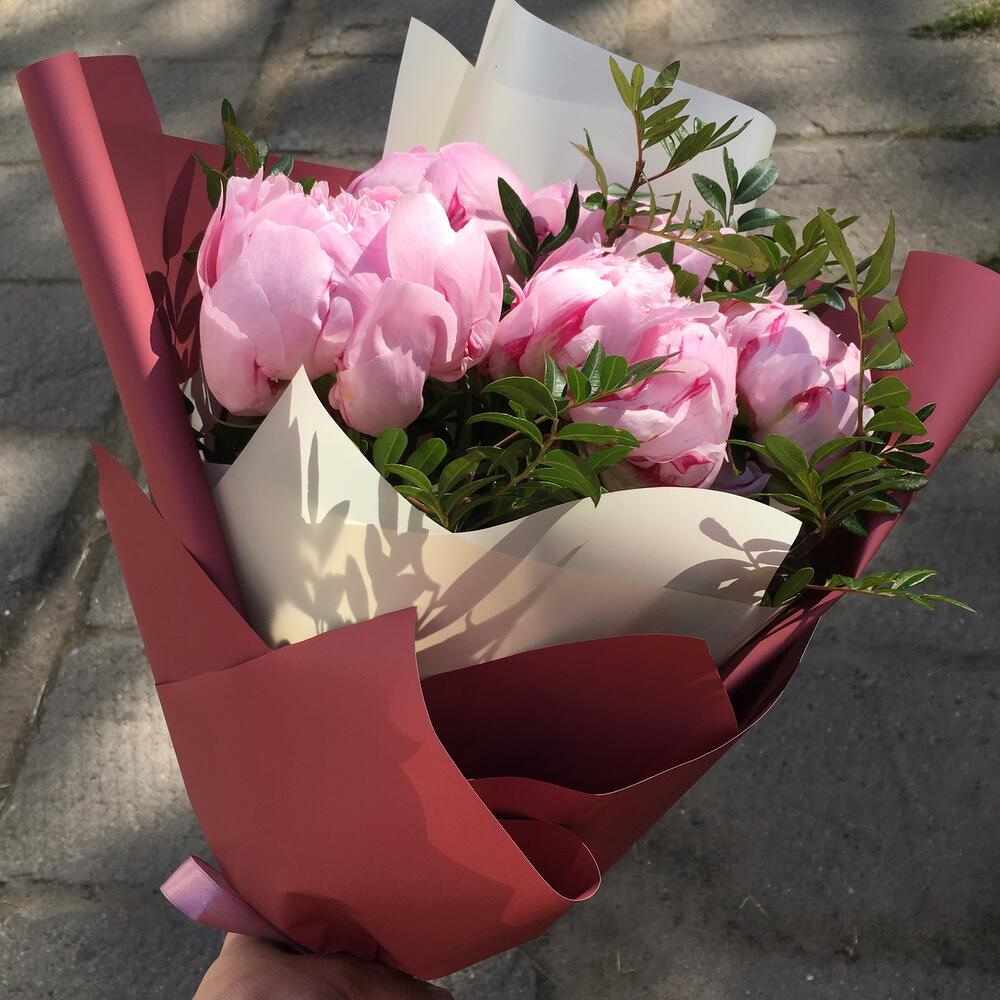 Букет из 5 пионов с зеленью