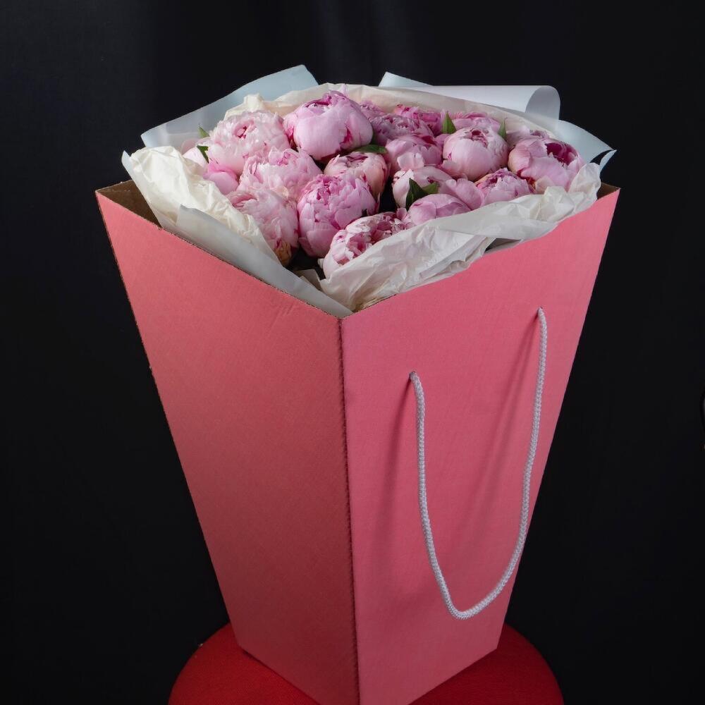 Пион розовый – 25 шт.Упаковка дизайнерская – 2 шт.Лента атласная – 2 шт.Открыточка с вашими пожеланиями – 1 шт.хорошее настроение – 100 шт.инструкция по уходу за цветами – 1 шт.коробка переноска – 1 шт.Кризал – 1 шт.