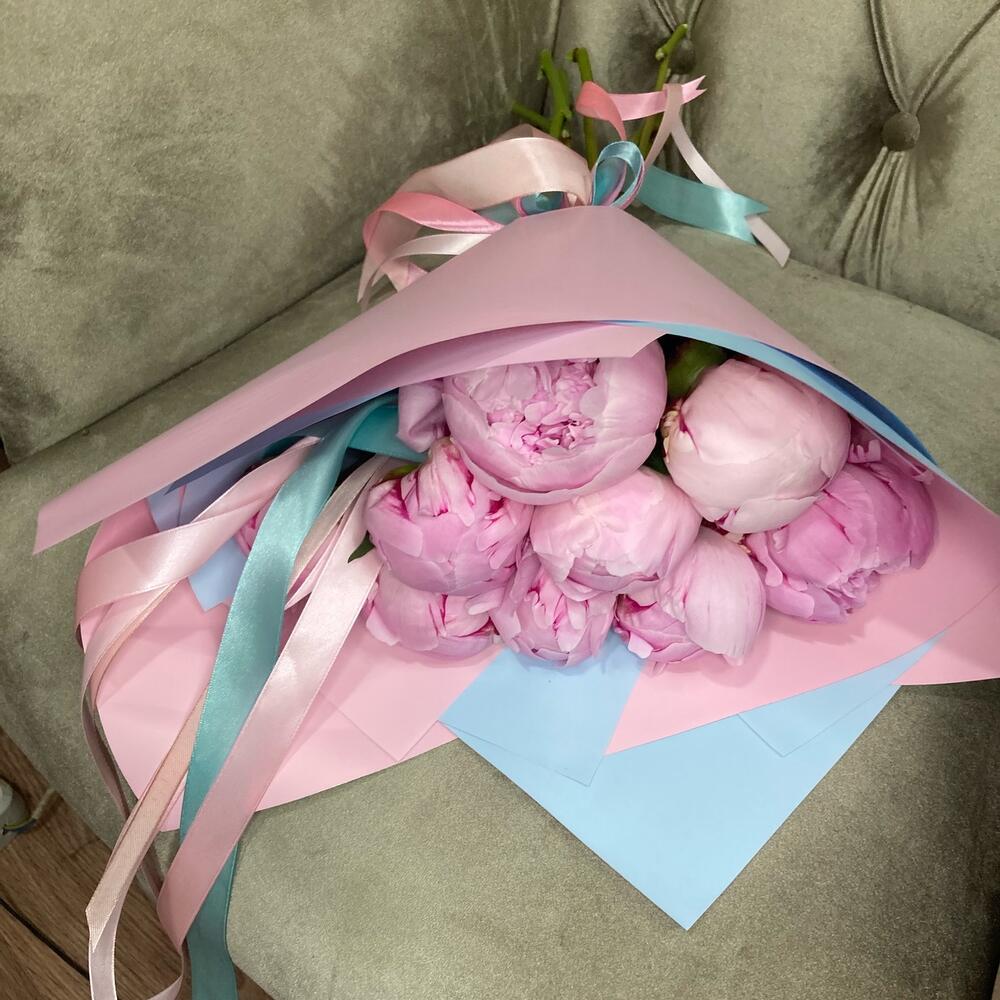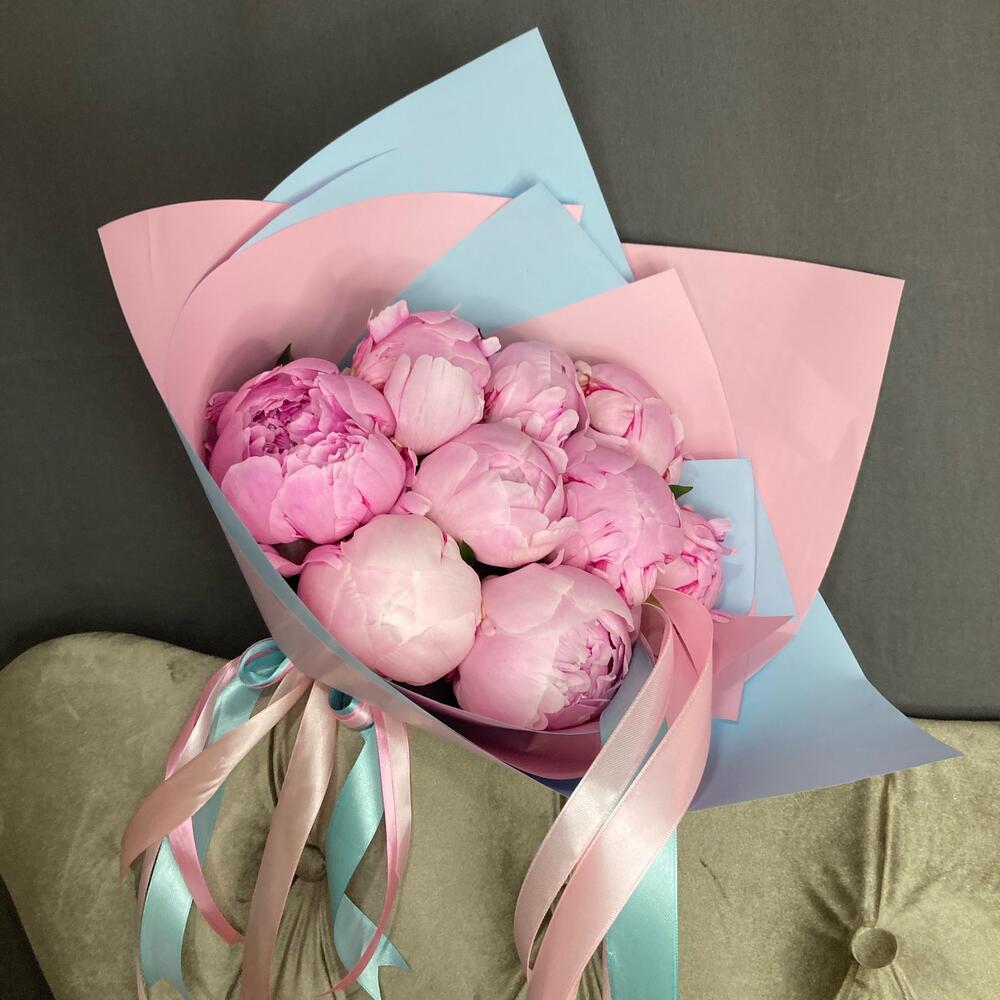 Лента атласная – 8 шт.Пион Сара Бернар – 9 шт.Упаковка дизайнерская – 4 шт.