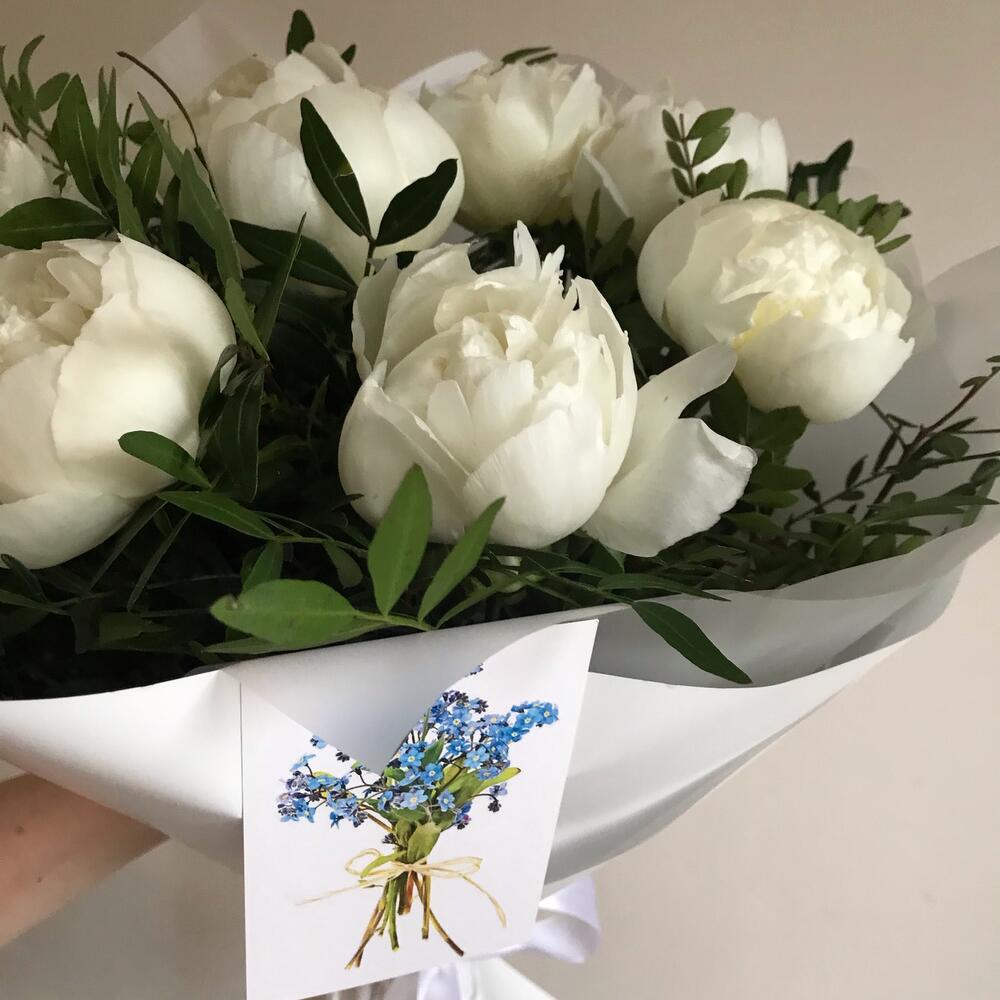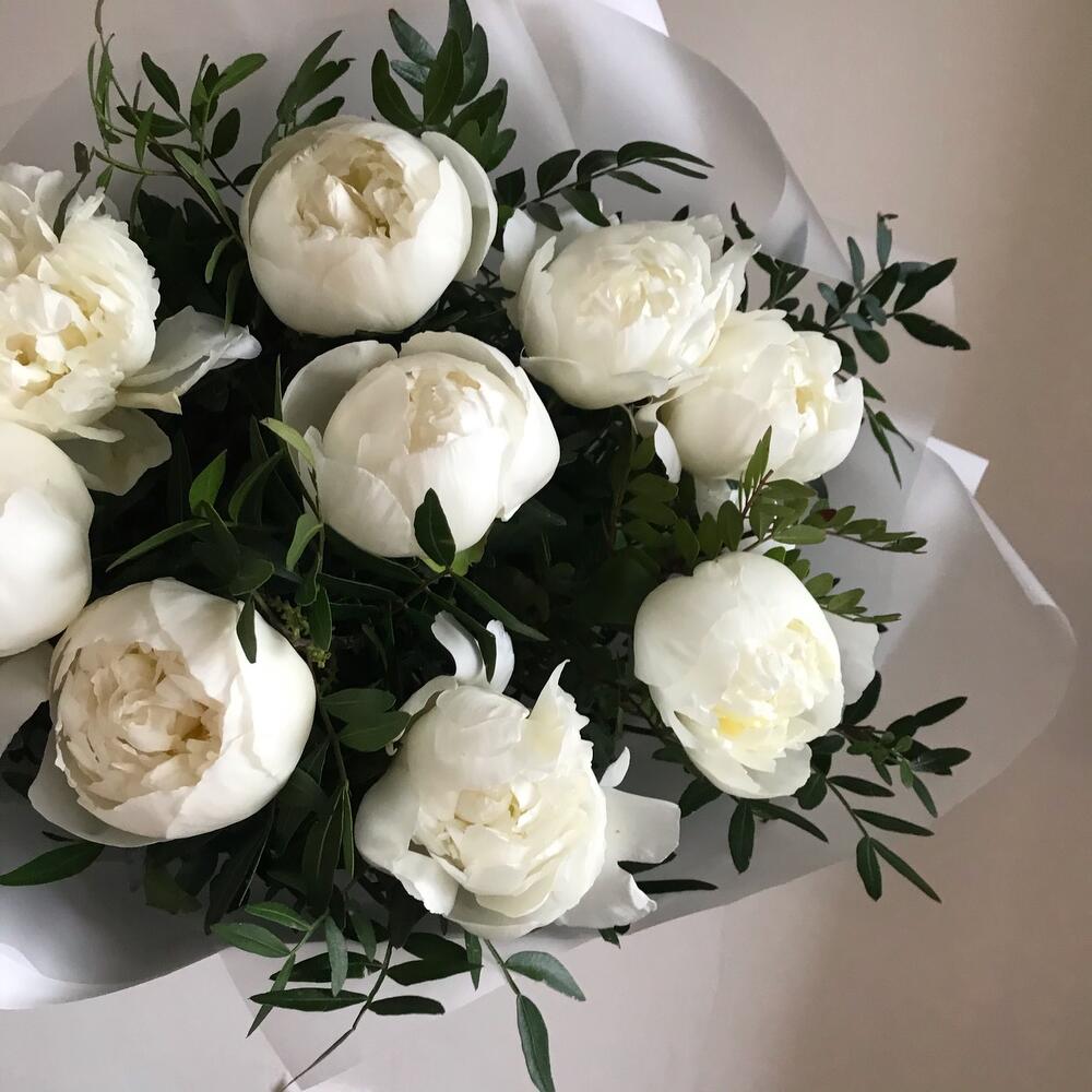 Лента – 2 шт.Зелень – 8 шт.Пион белый – 9 шт.Упаковка дизайнерская – 4 шт.
