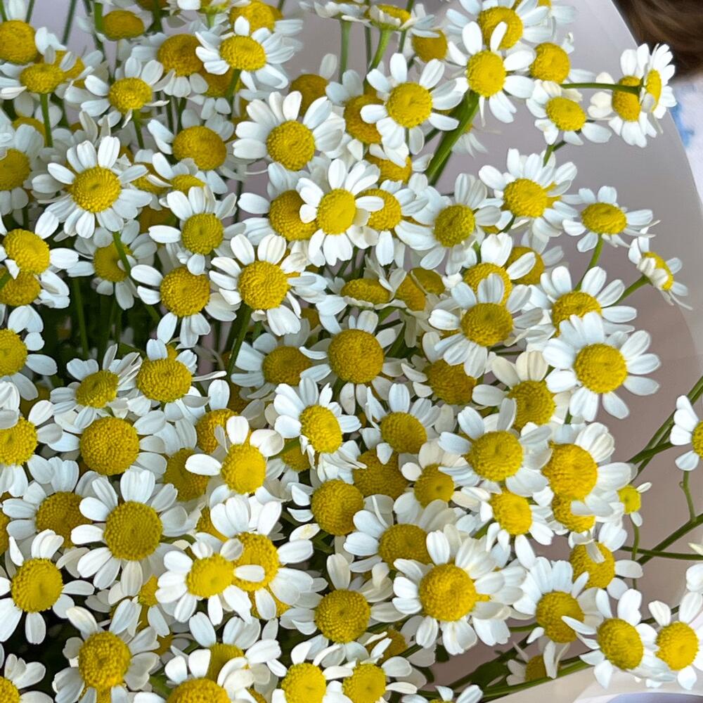 Лента – 1 шт.Дизайнерская упаковка – 1 шт.матрикария (голландская ромашка) – 7 шт.