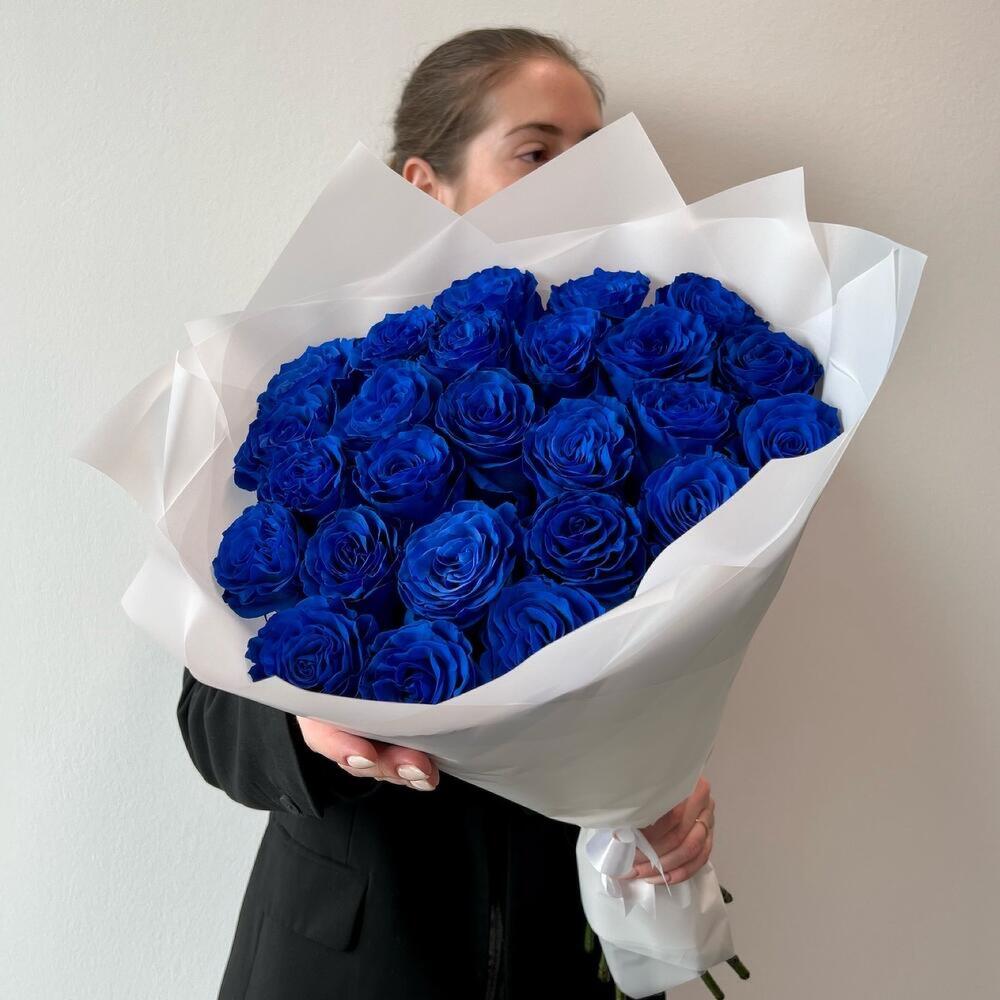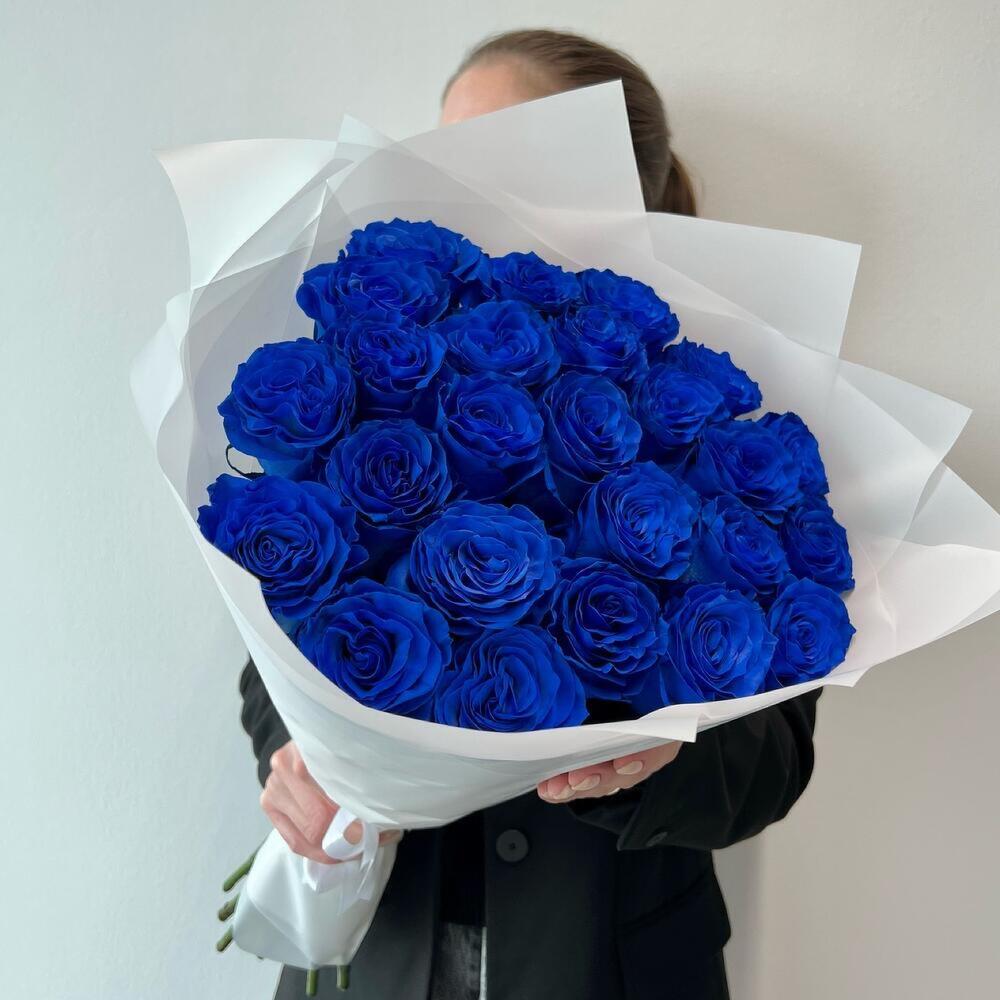 синие розы эквадор – 25 шт. Упаковка дизайнерская – 2 шт. Открыточка с вашими пожеланиями – 1 шт. инструкция по уходу за цветами – 1 шт.