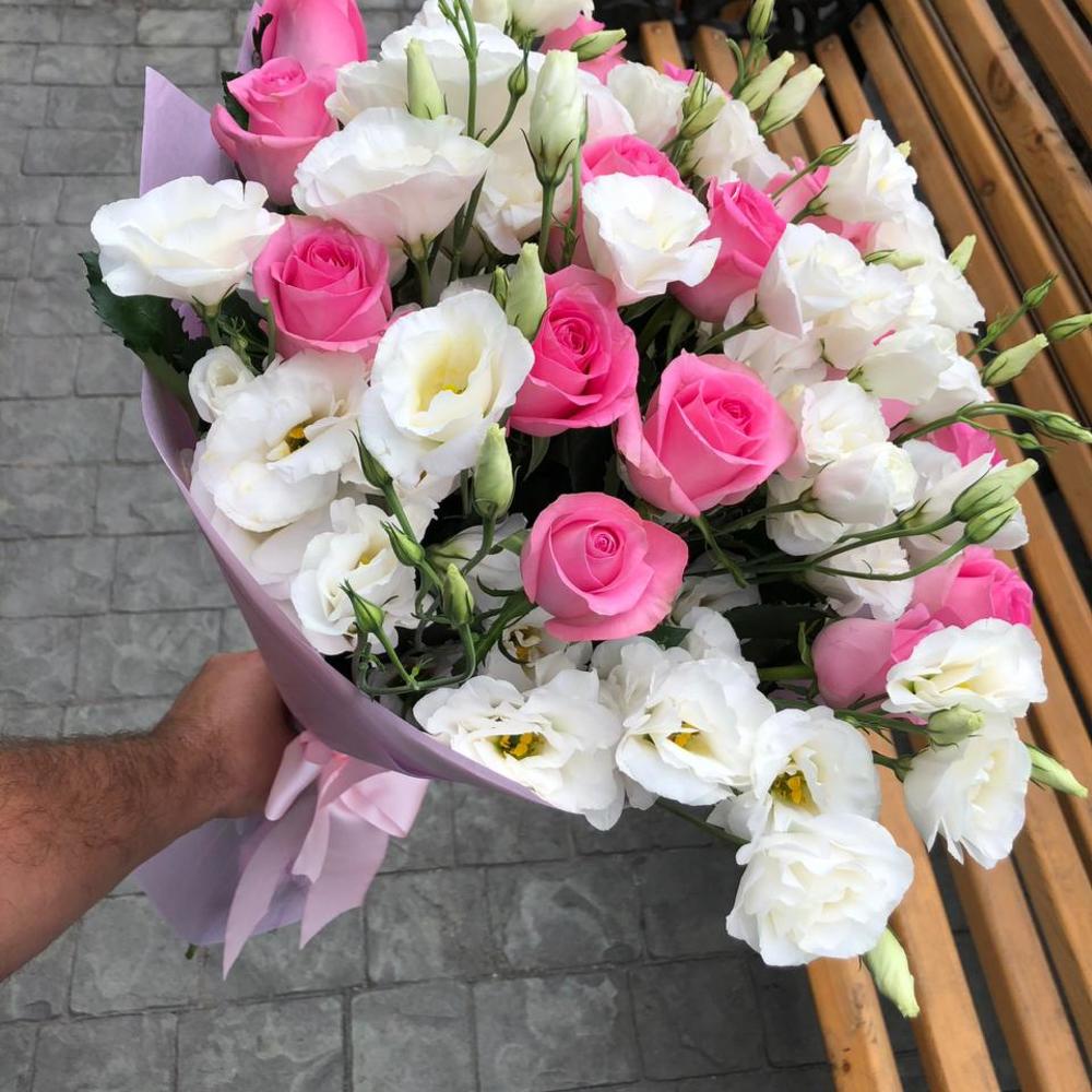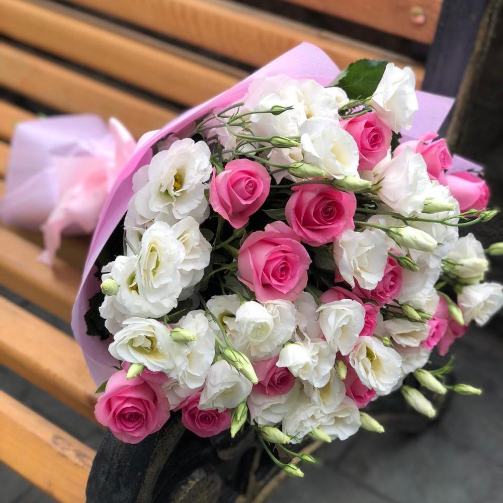 Роза розовая – 15 шт. эустома белая – 10 шт. Упаковка пленка матовая – 1 шт.