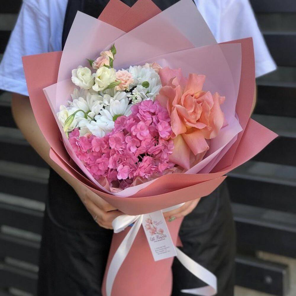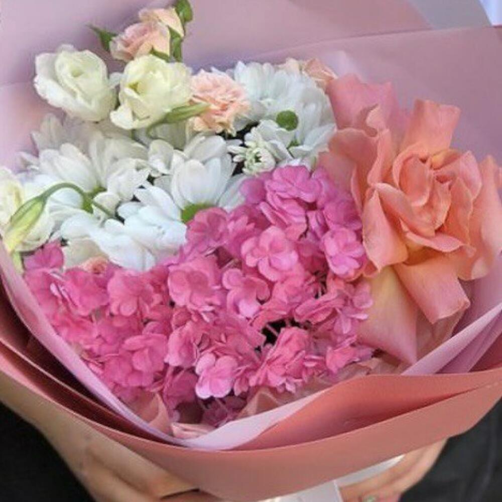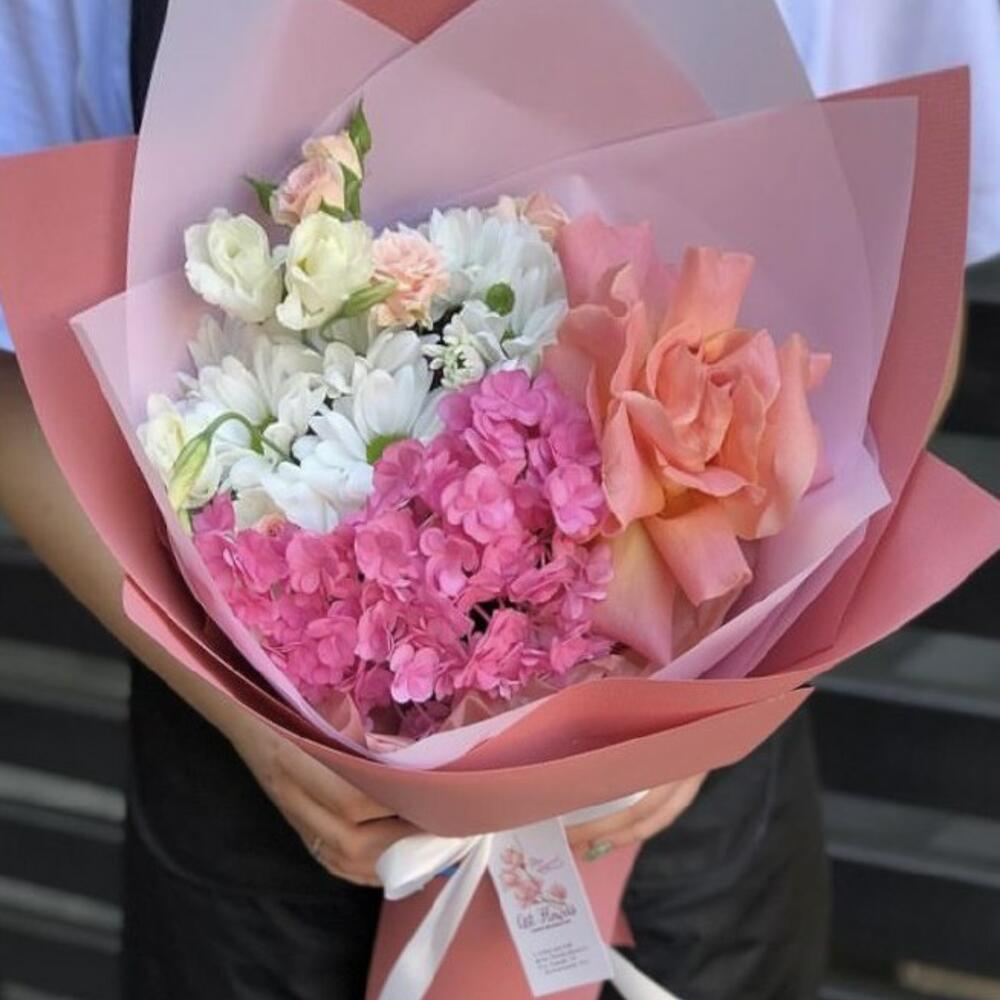 Альстромерии, Гвоздики, Кустовые розы, Лизиантусы, Розы, Хризантемы