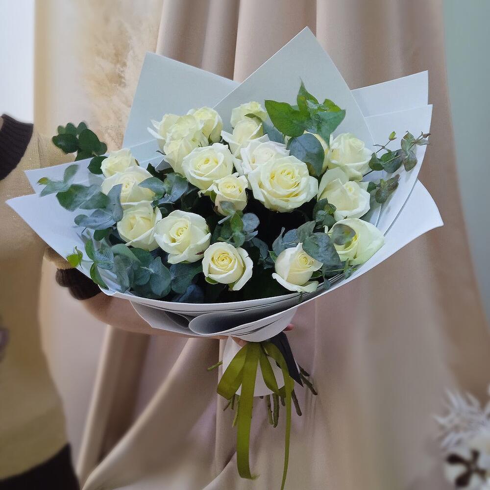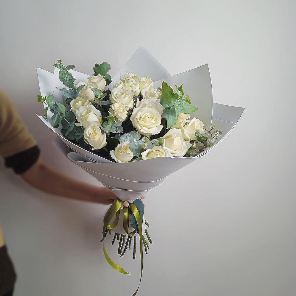 Роза – 21 шт.Эвкалипт – 6 шт.Дизайнерская упаковка – 1 шт.Лента атласная – 1 шт.подкормка для срезанных цветов – 1 шт.