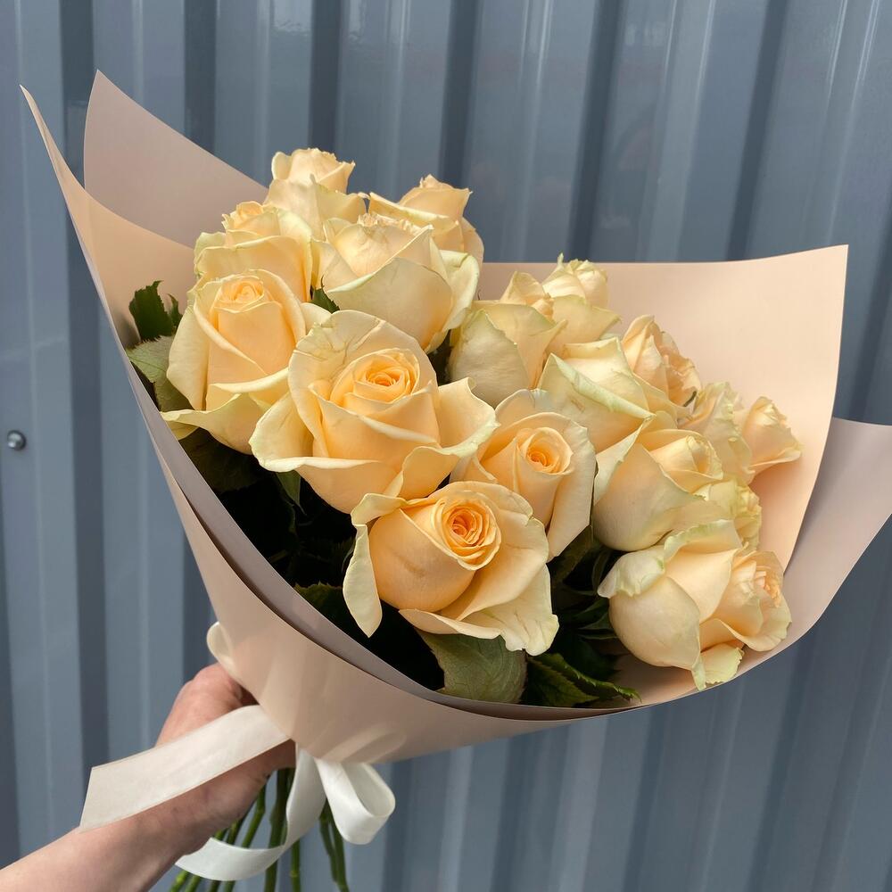 Роза пич аваланж 50 см – 15 шт.Упаковка дизайнерская – 1 шт.Лента атласная – 1 шт.