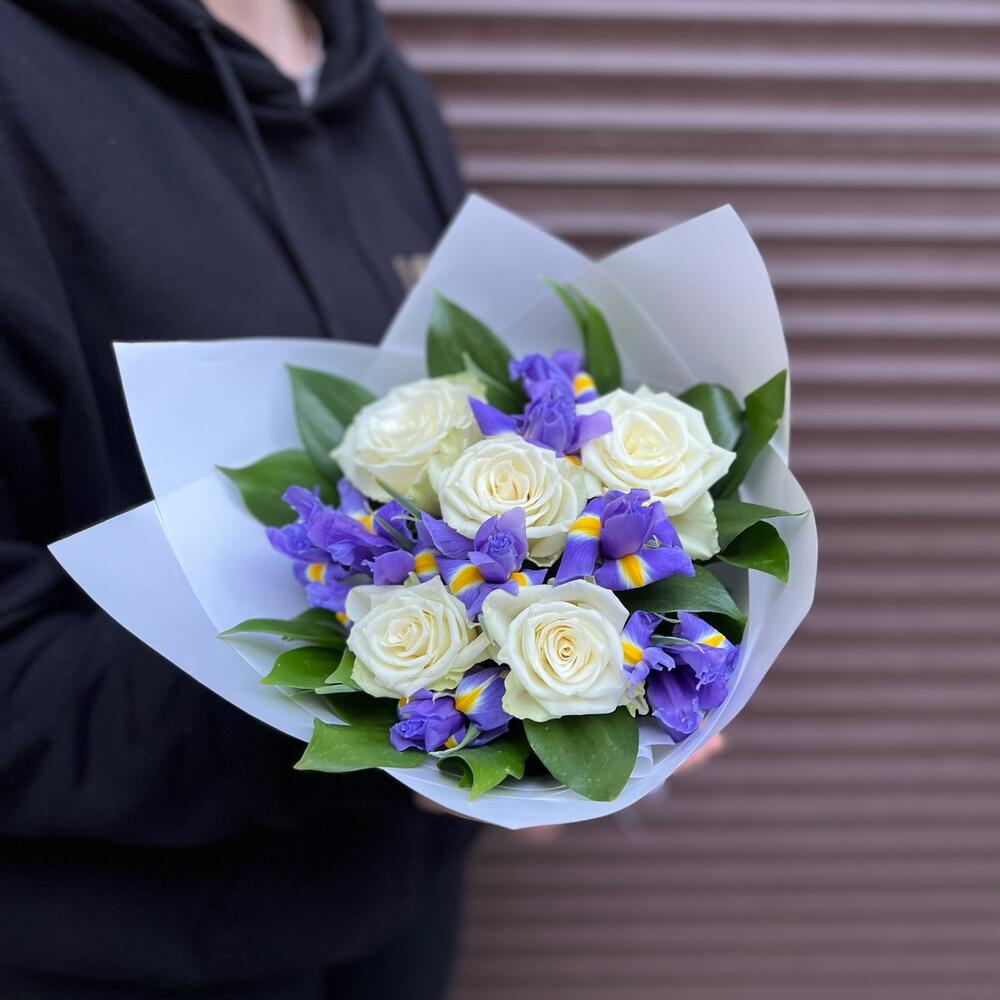 Ирис – 8 шт.Зелень – 8 шт.Роза белая – 5 шт.корея пленка – 1 шт.