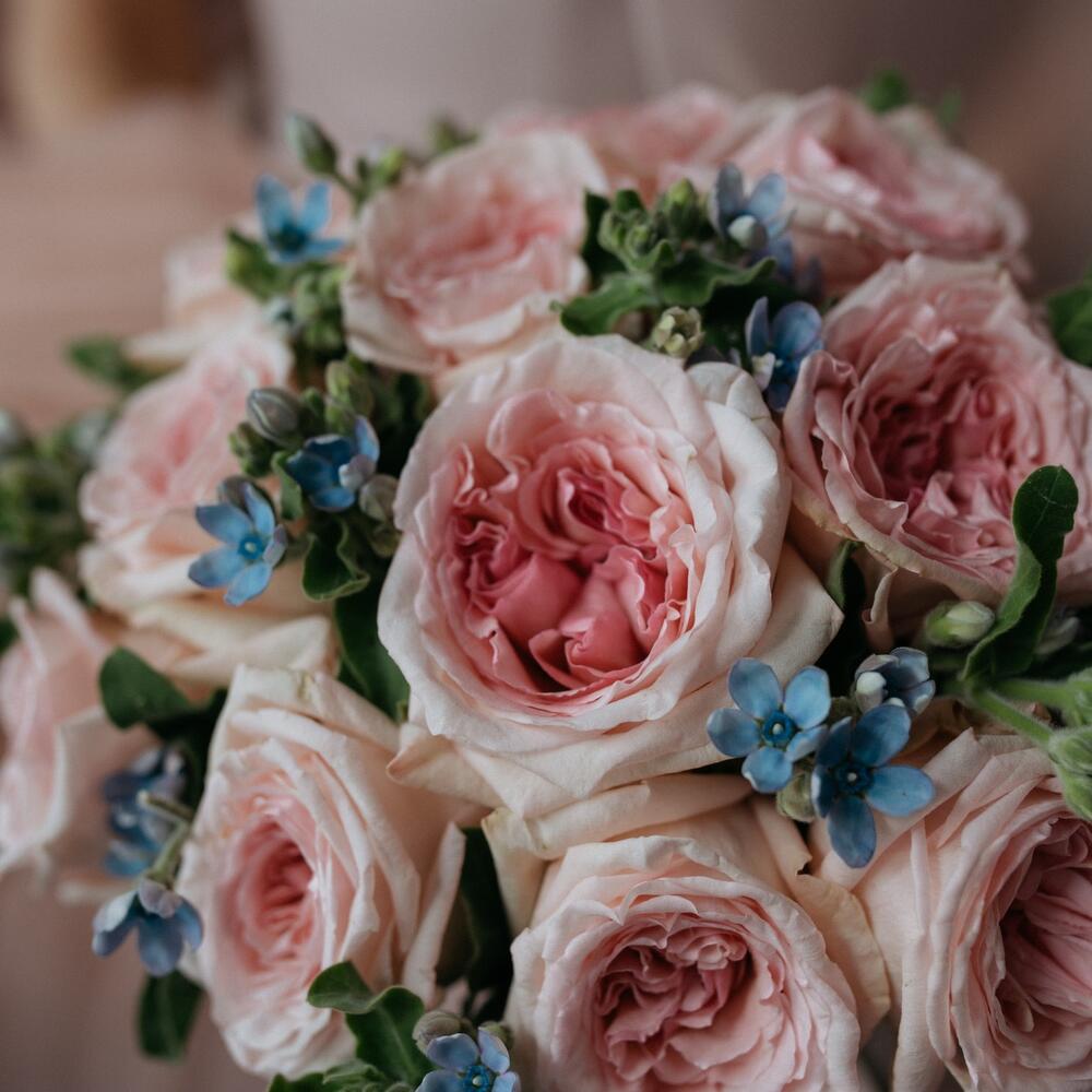 Пионовидная роза – 11 шт.Атласная лента – 1 шт.Оксипеталум – 9 шт.