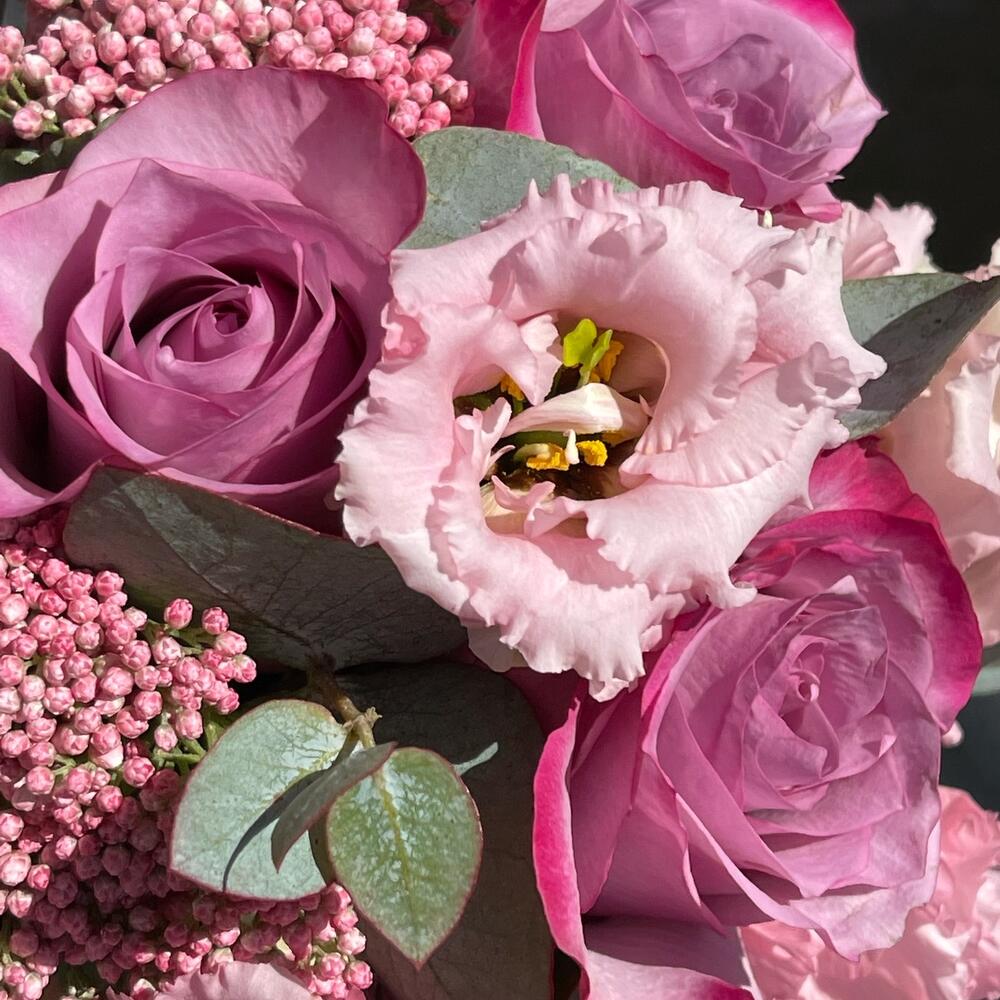 Лента – 2 шт.Лизиантус – 2 шт.Озотамнус – 2 шт.Роза одноголовая – 5 шт.