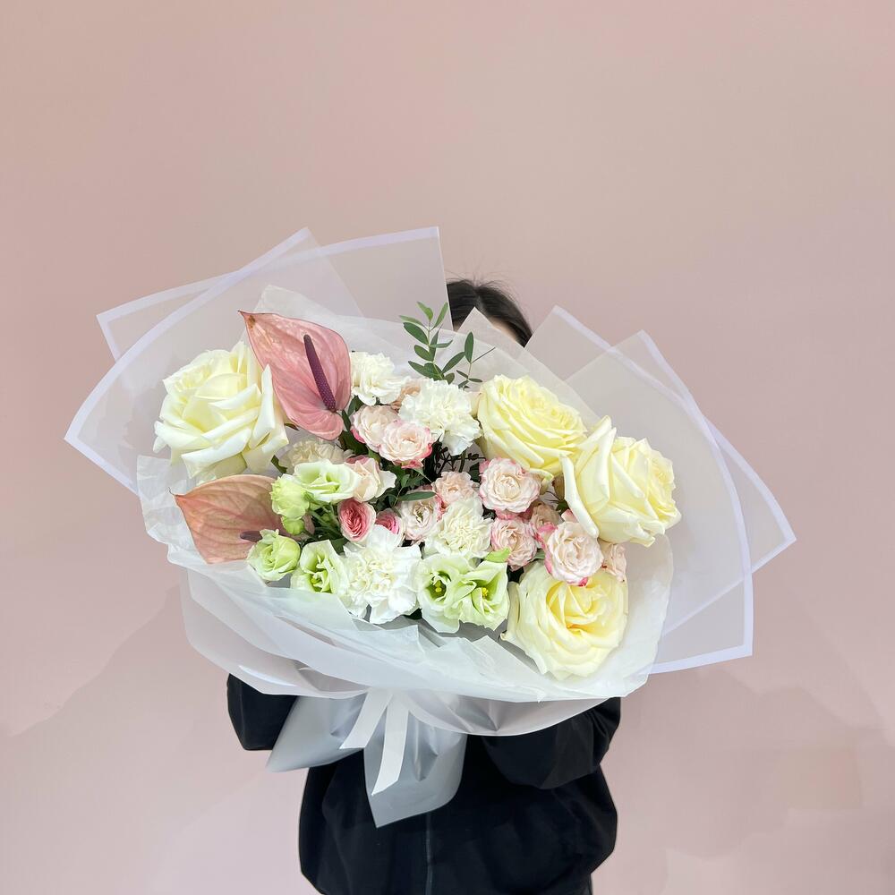Альстромерии, Гвоздики, Кустовые розы, Лизиантусы, Розы, Хризантемы