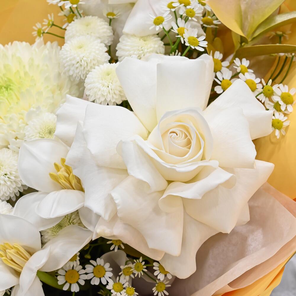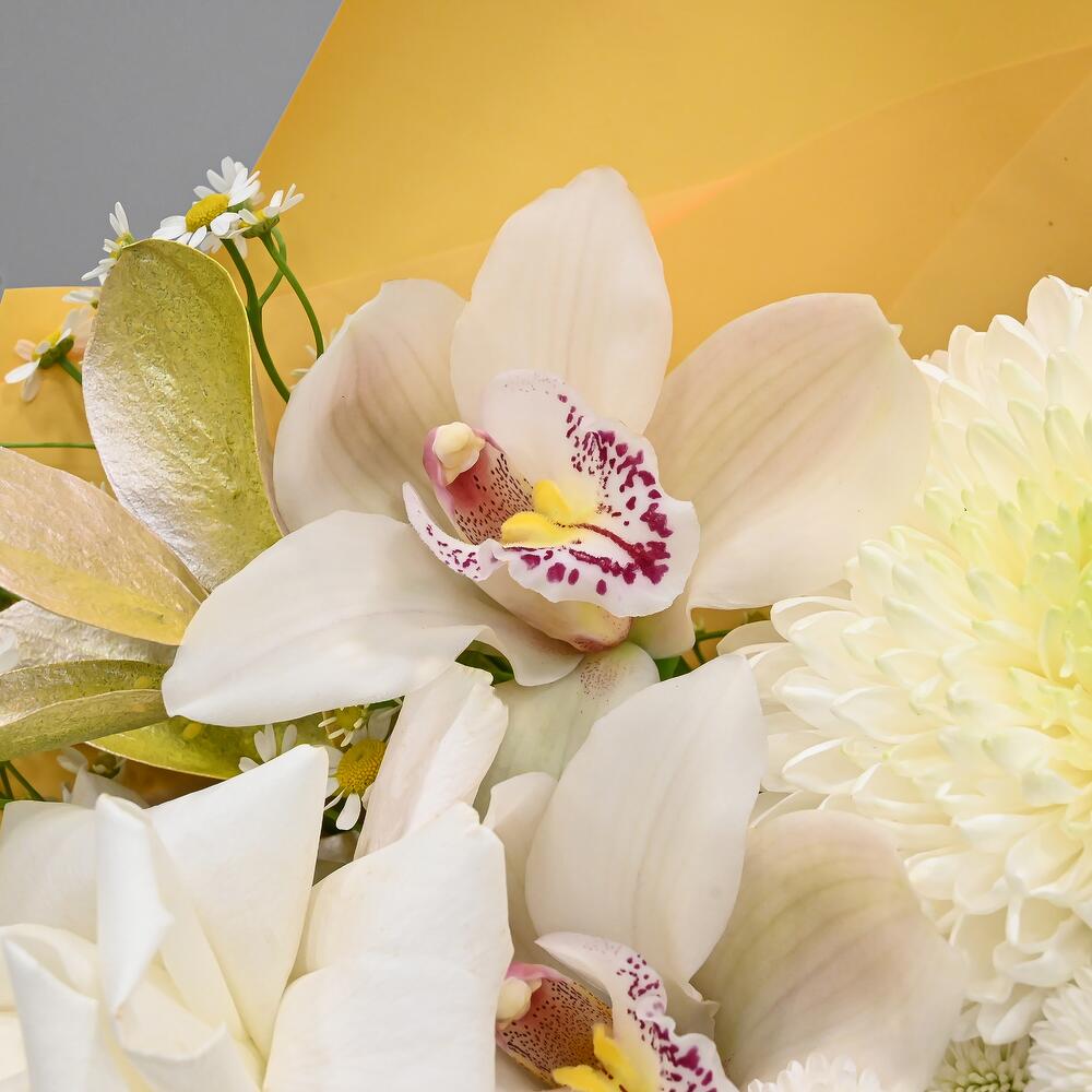Орхидея Цимбидиум – 2 шт.Рускус – 3 шт.Тюльпан – 2 шт.Хризантема кустовая – 3 шт.Ромашка – 3 шт.Хризантема – 1 шт.Упаковка дизайнерская – 1 шт.Французская роза – 3 шт.