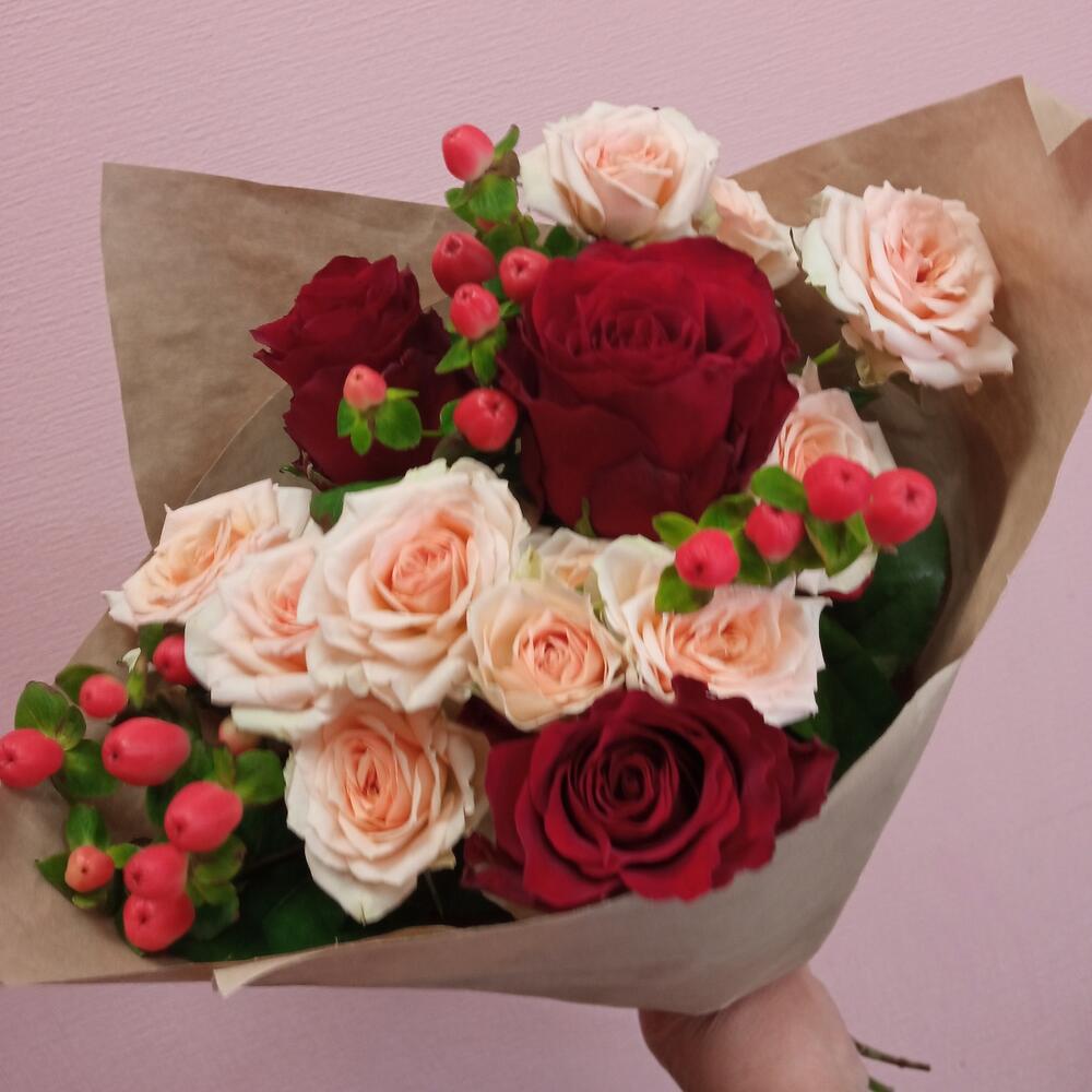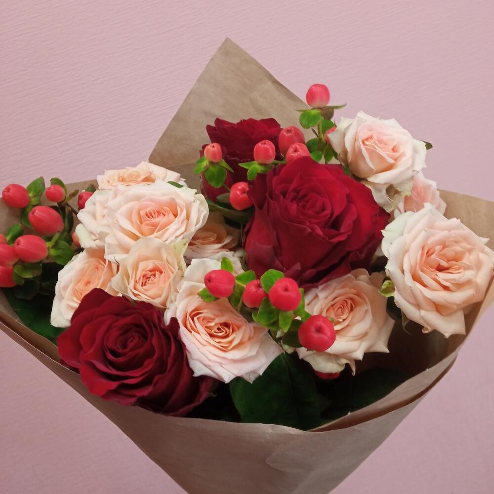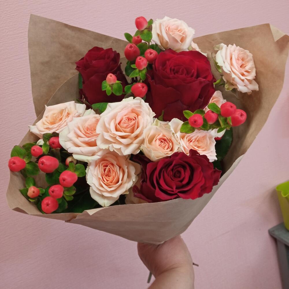 Букет с розами и гиперикумом