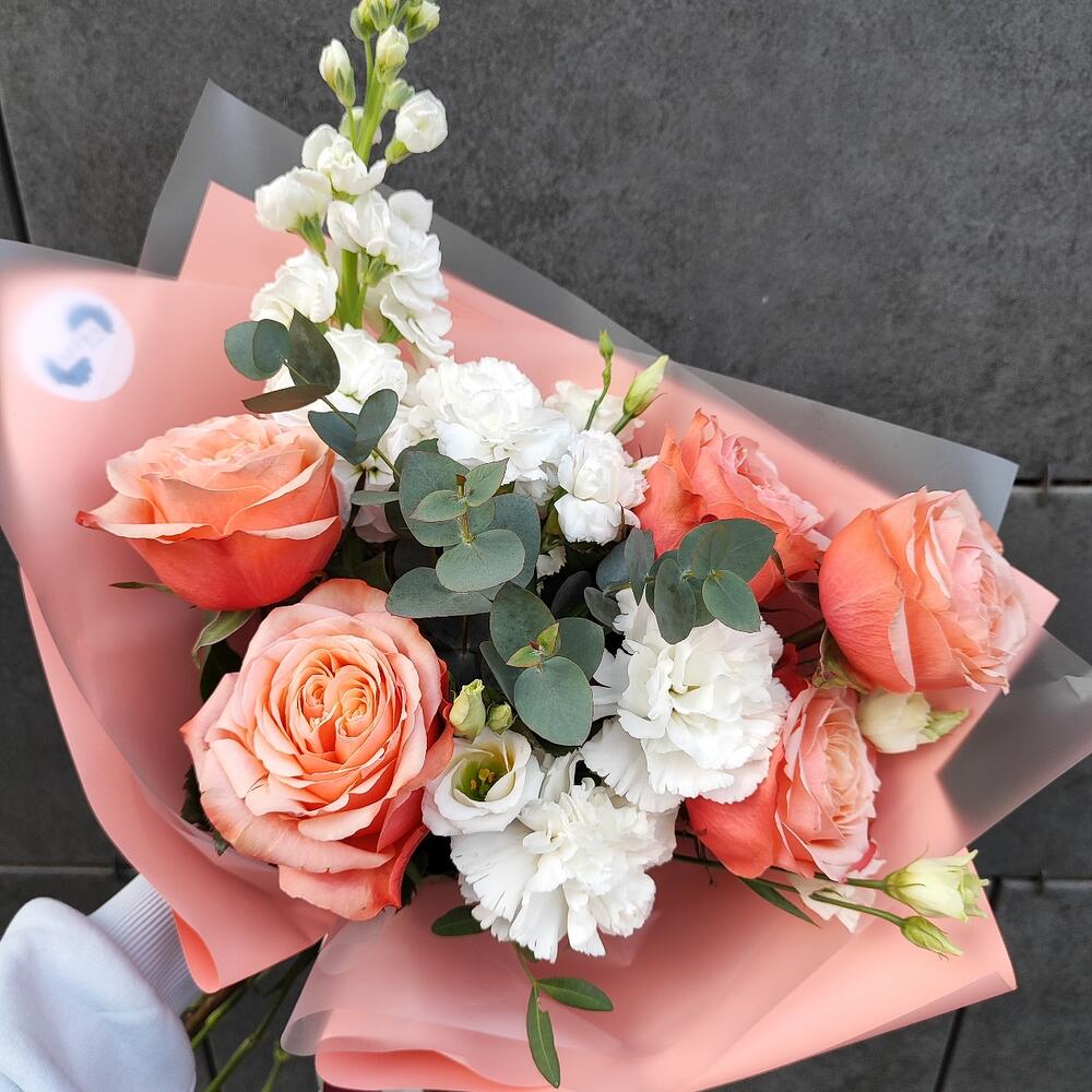 Роза кахала – 5 шт.Гвоздика одноголовая – 3 шт.Гвоздика кустовая – 1 шт.Лизиантус Алиса белый – 1 шт.Эвкалипт – 1 шт.Фисташка – 1 шт.Авторская упаковка – 1 шт.Атласная лента – 1 шт.