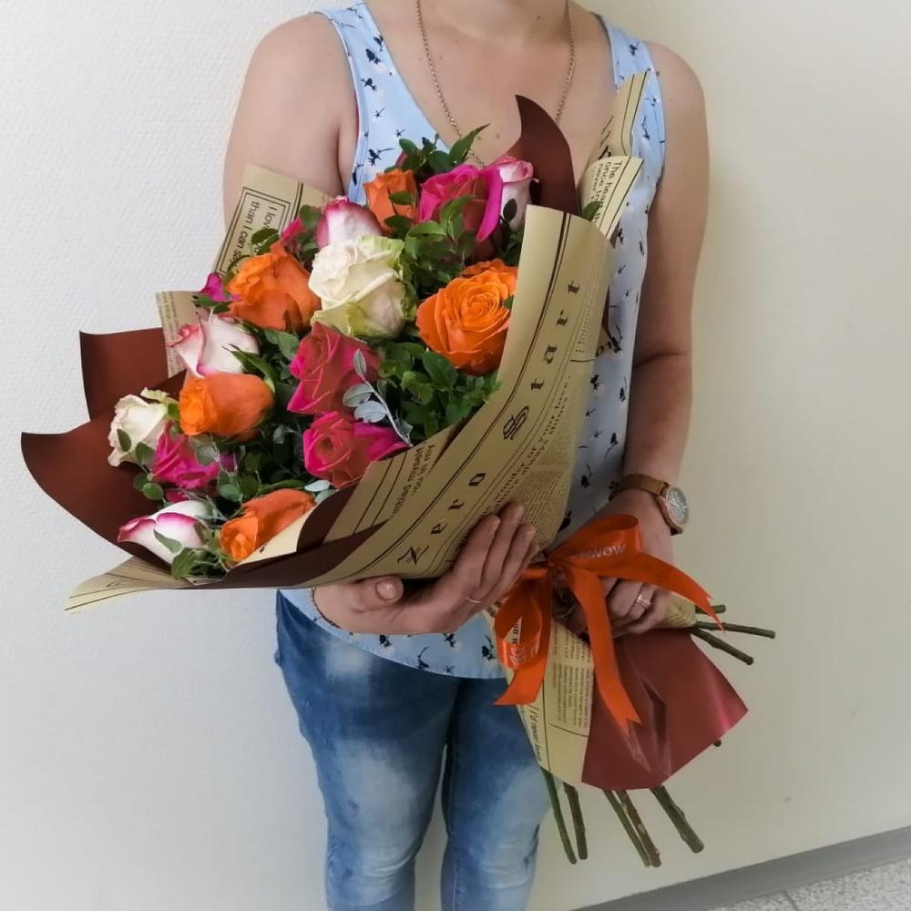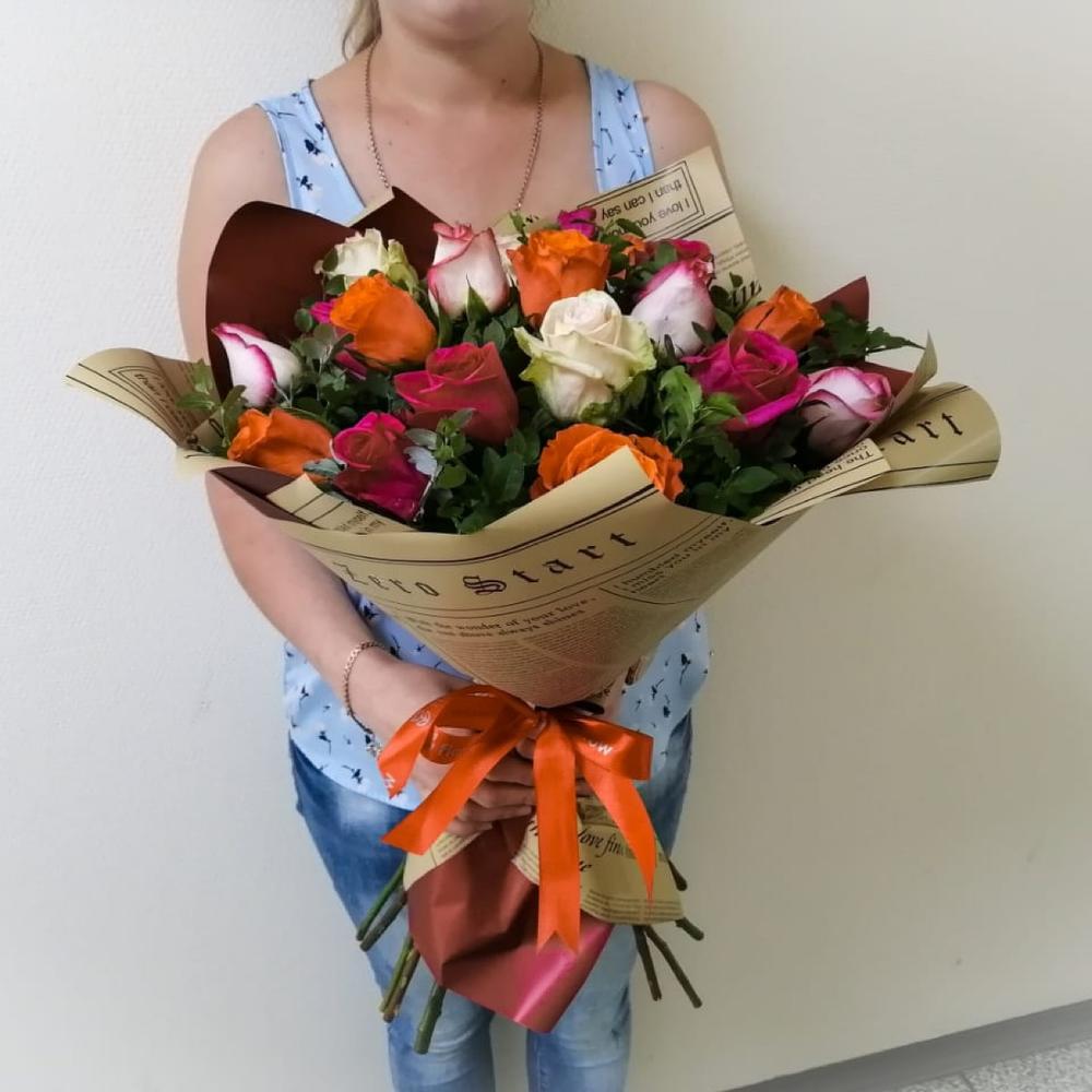 Упаковка дизайнерская – 1 шт.зелень декоративная – 6 шт.роза микс – 15 шт.