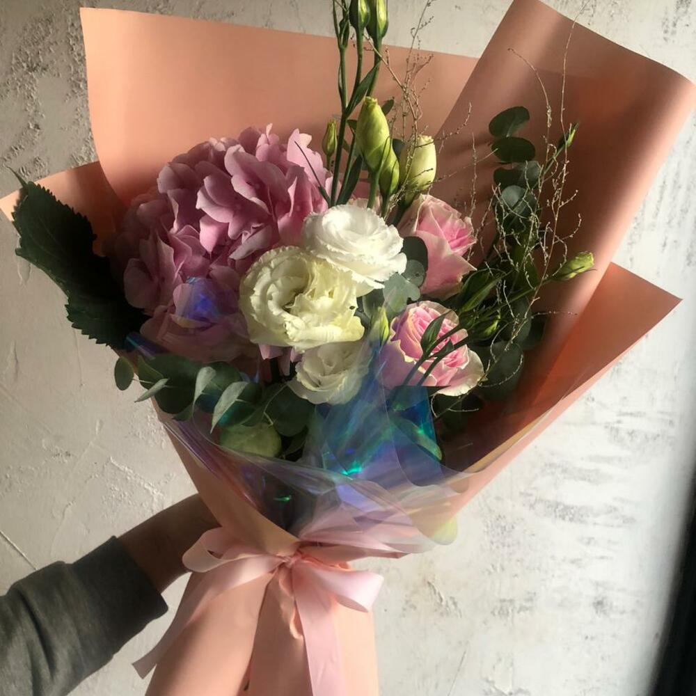 Гвоздики, Лизиантусы, Розы, Тюльпаны